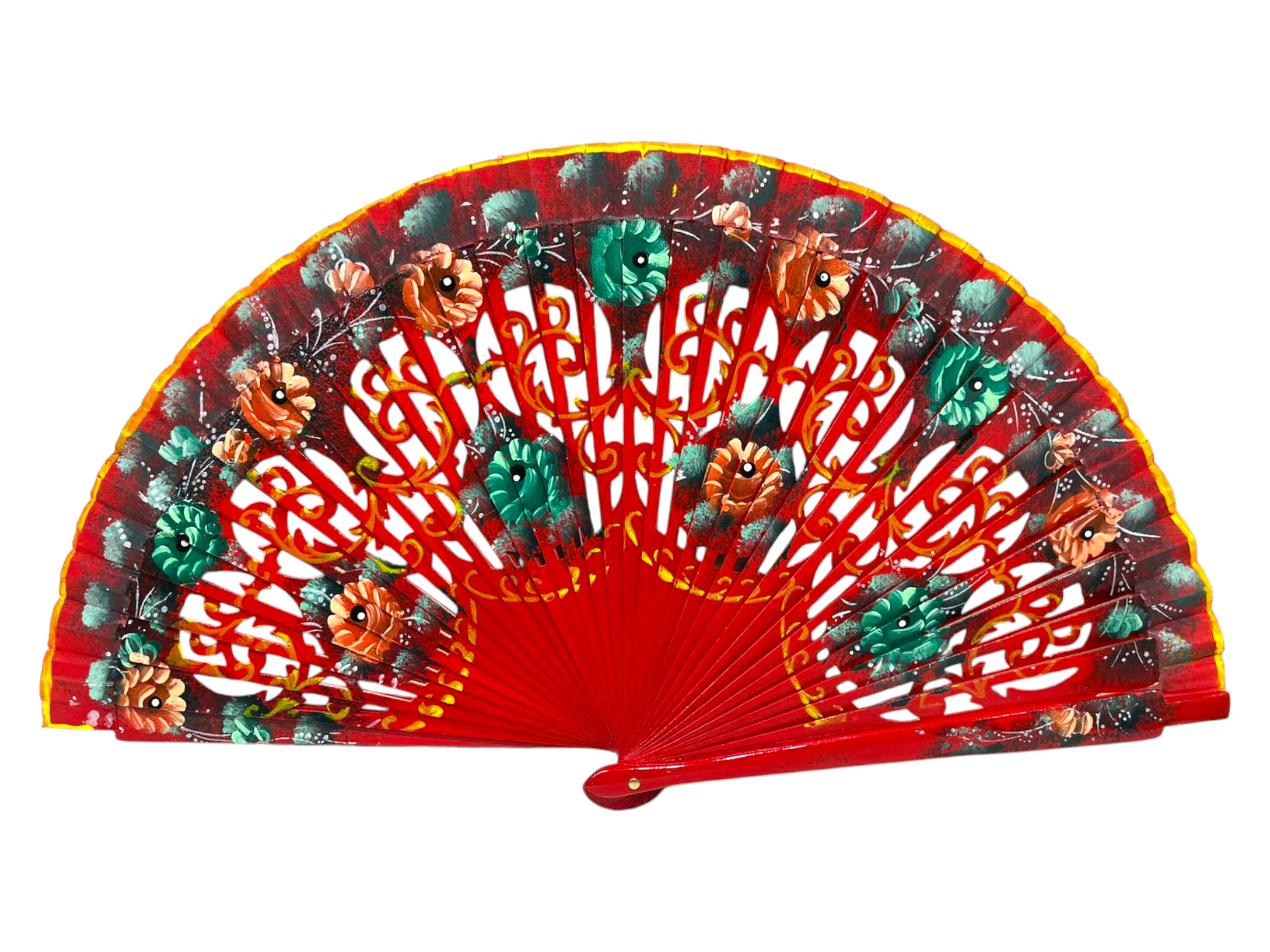 Estos abanicos son de una gran belleza, fabricados en madera y tela. El abanico es rojo y están pintadas unas bonitas flores.