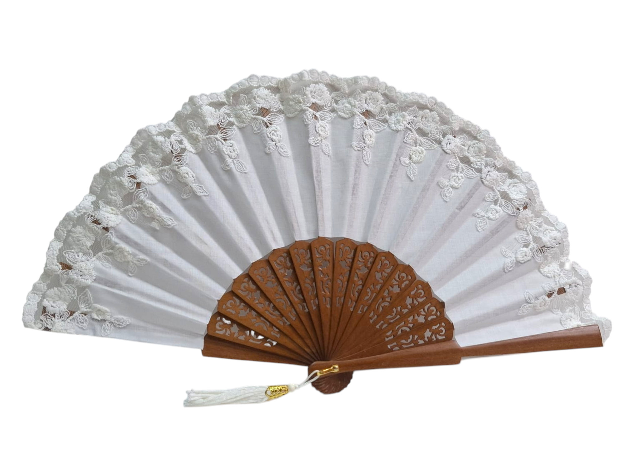 Abanico de boda para novia fabricado en encaje marfil, tela blanca y madera color avellana. Diseño clásico y elegante, ideal para novias que buscan un complemento nupcial refinado.