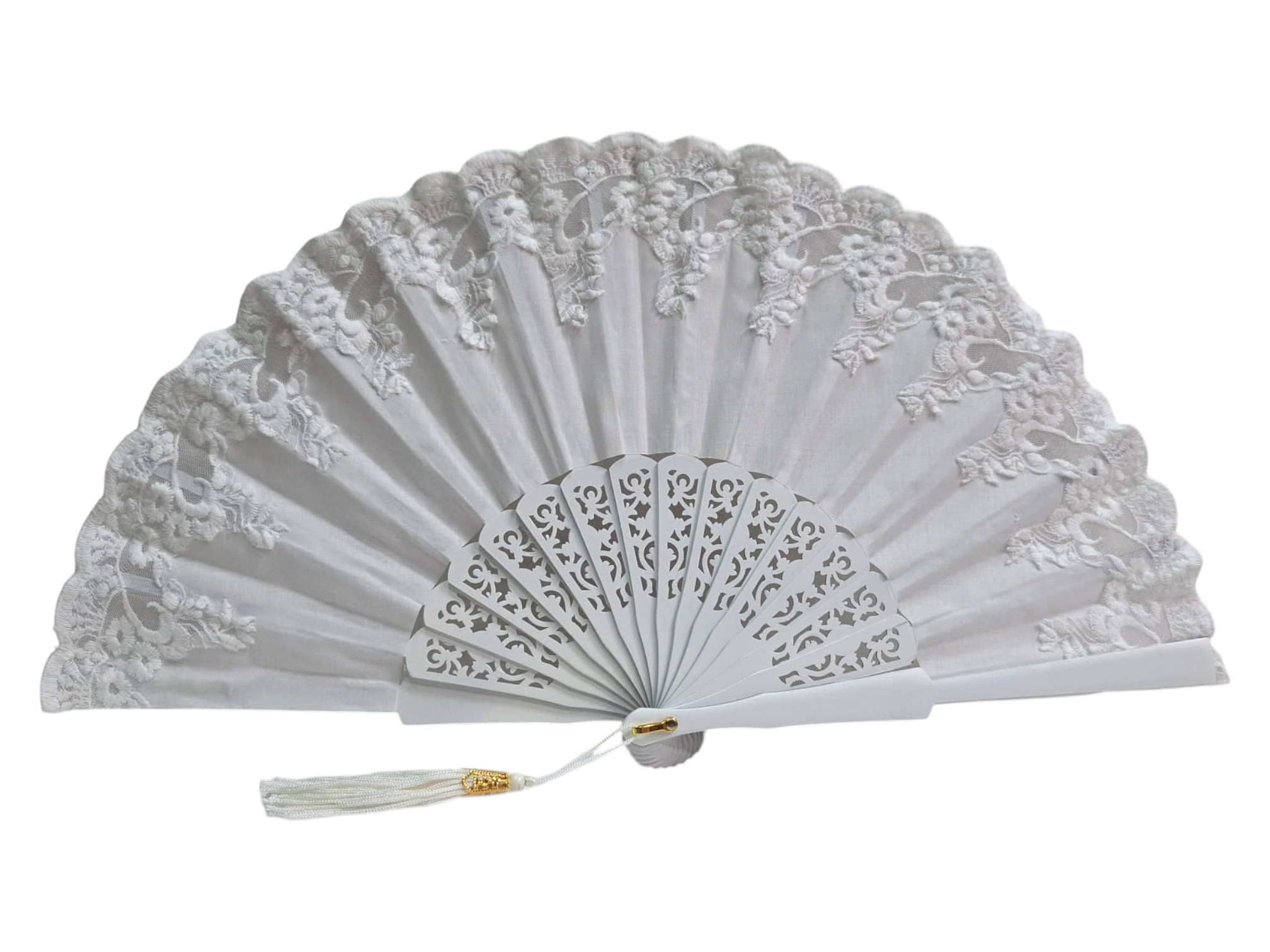 Abanico nupcial elegante de encaje marfil y tela blanca con diseño calado en madera