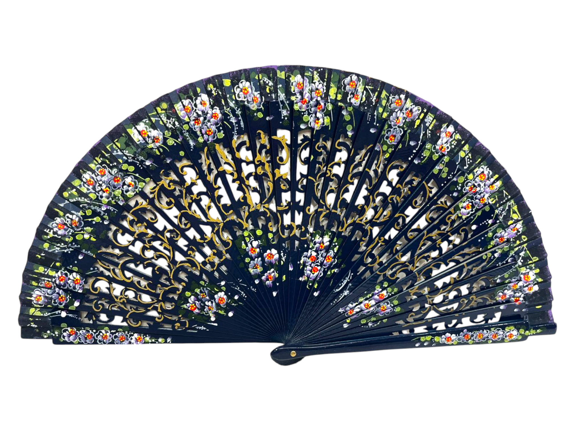 Abanico pintado por las dos caras con motivos florales. Es un abanico de madera calada.