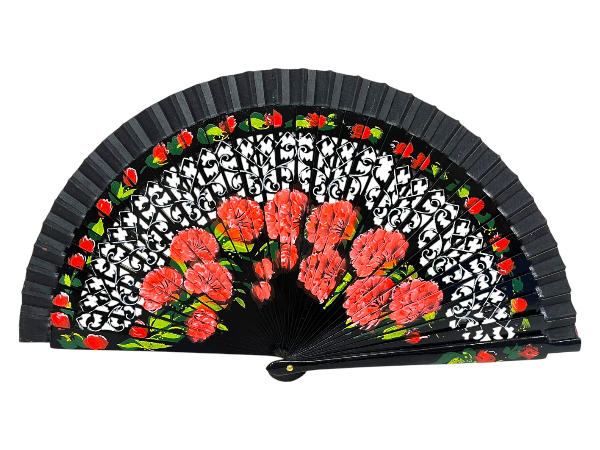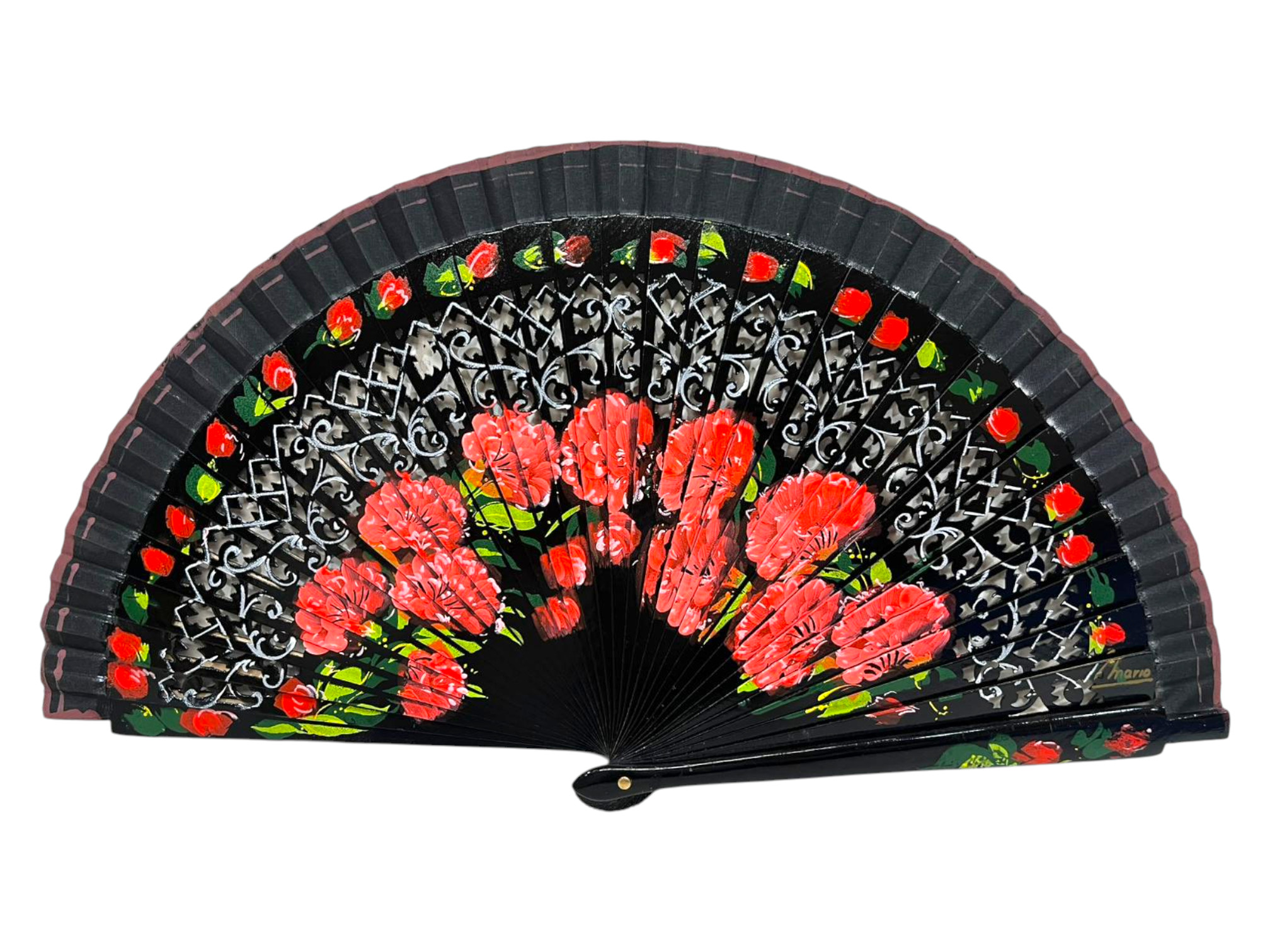 Abanico español de flores pintadas a mano ambas caras madera calada. Ref.1299