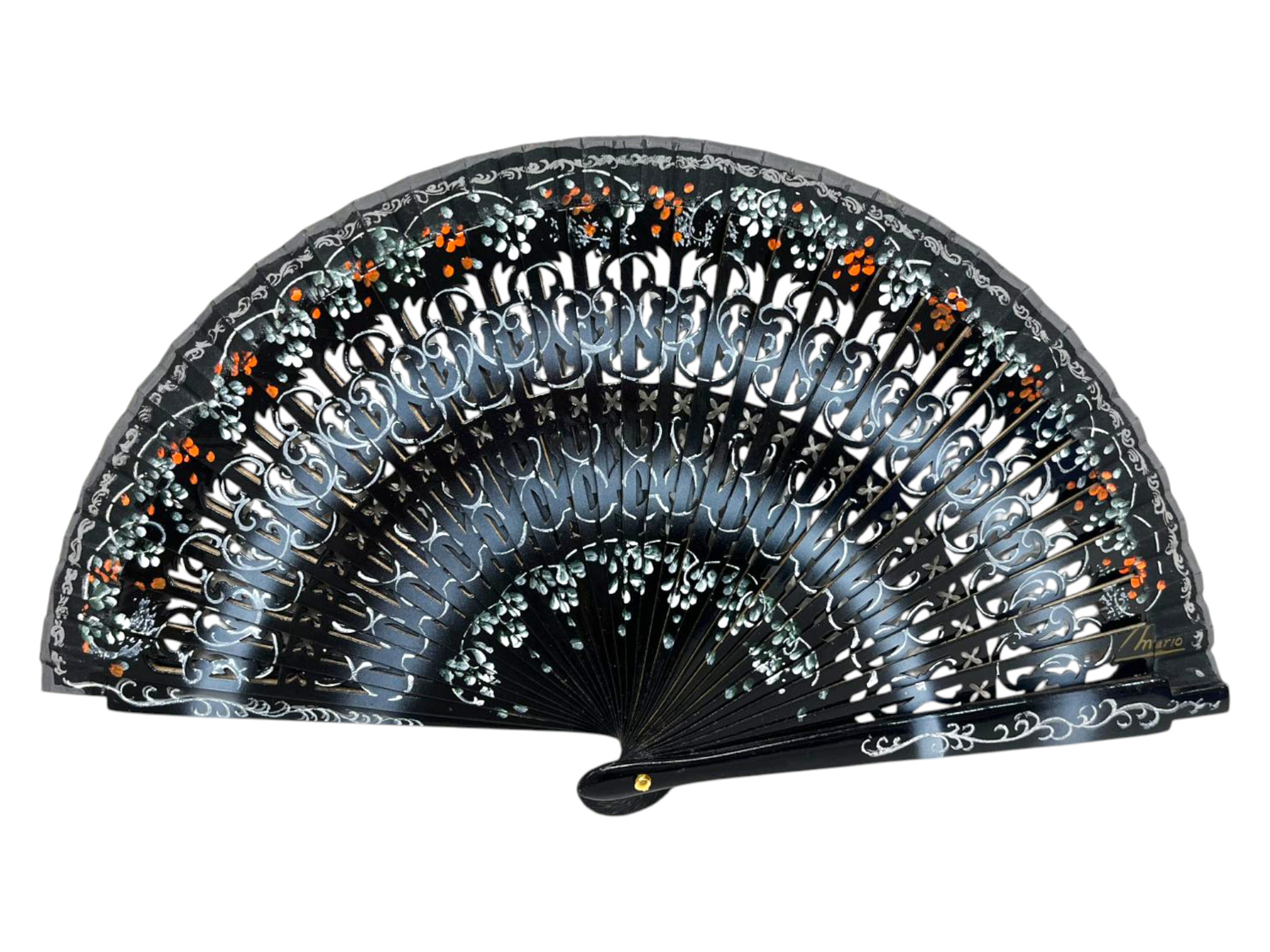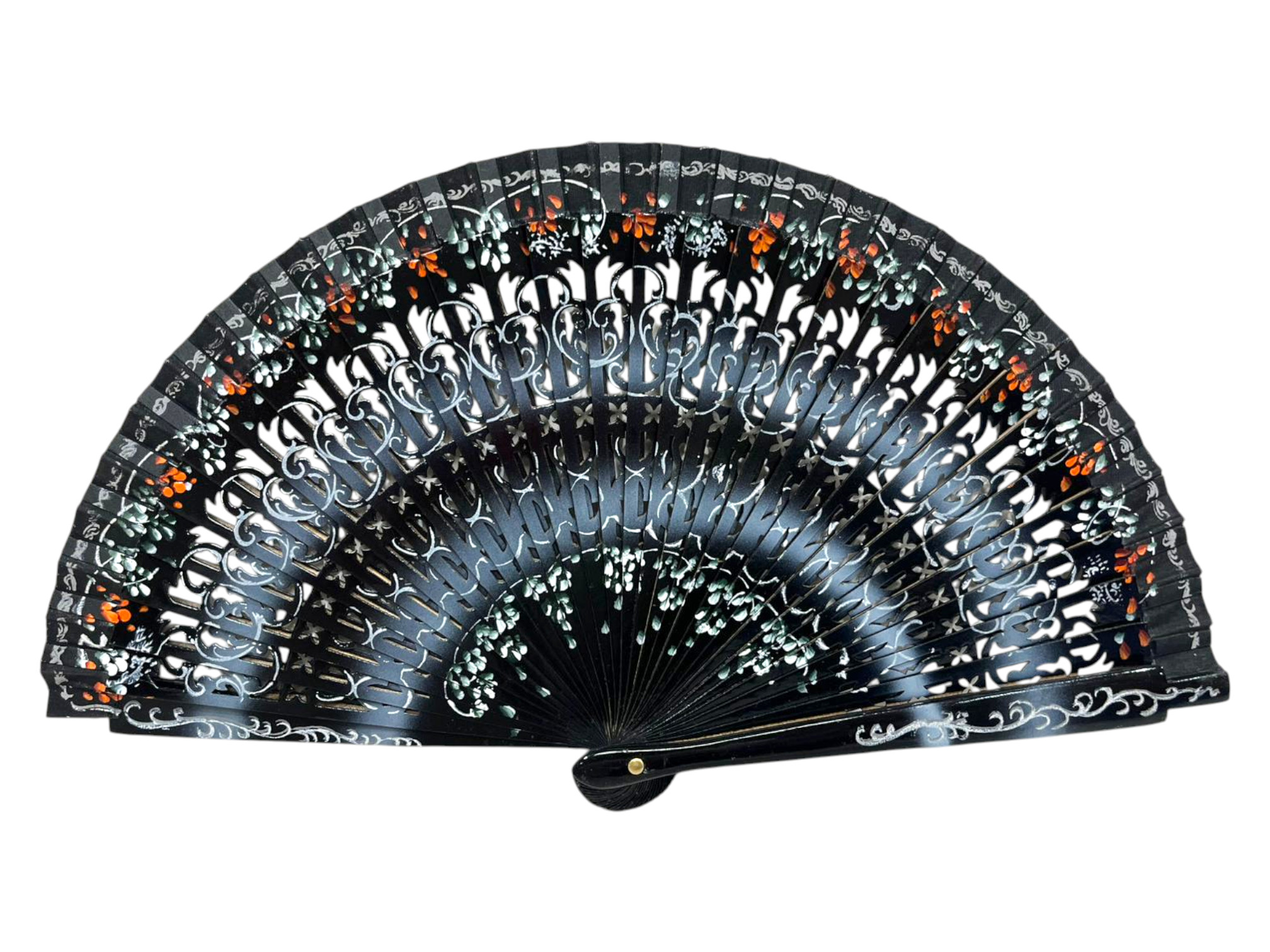Abanico pequeño de madera calada y tela, pintado a doble cara con elegantes flores. Ligero, perfecto para llevar en el bolso. Este abanico floral combina tradición y estilo, siendo un accesorio imprescindible para el verano y un icono de la moda española.