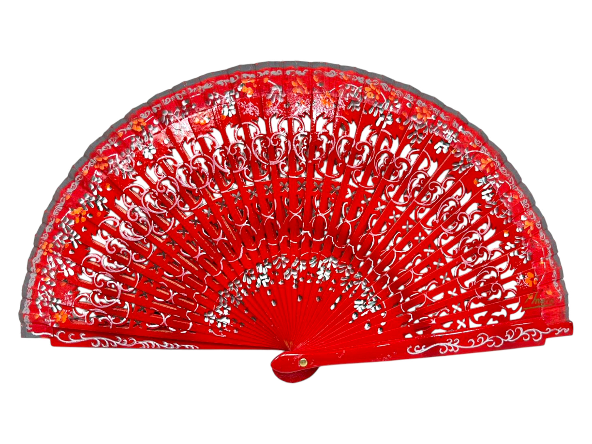 Abanico de madera pequeño con diseño floral pintado en ambas caras, ideal para bolso. Su tamaño compacto y su elegante color rojo lo convierten en un accesorio práctico y sofisticado. Perfecto para el calor, este abanico español destaca por su belleza, ligereza y acabado artesanal.