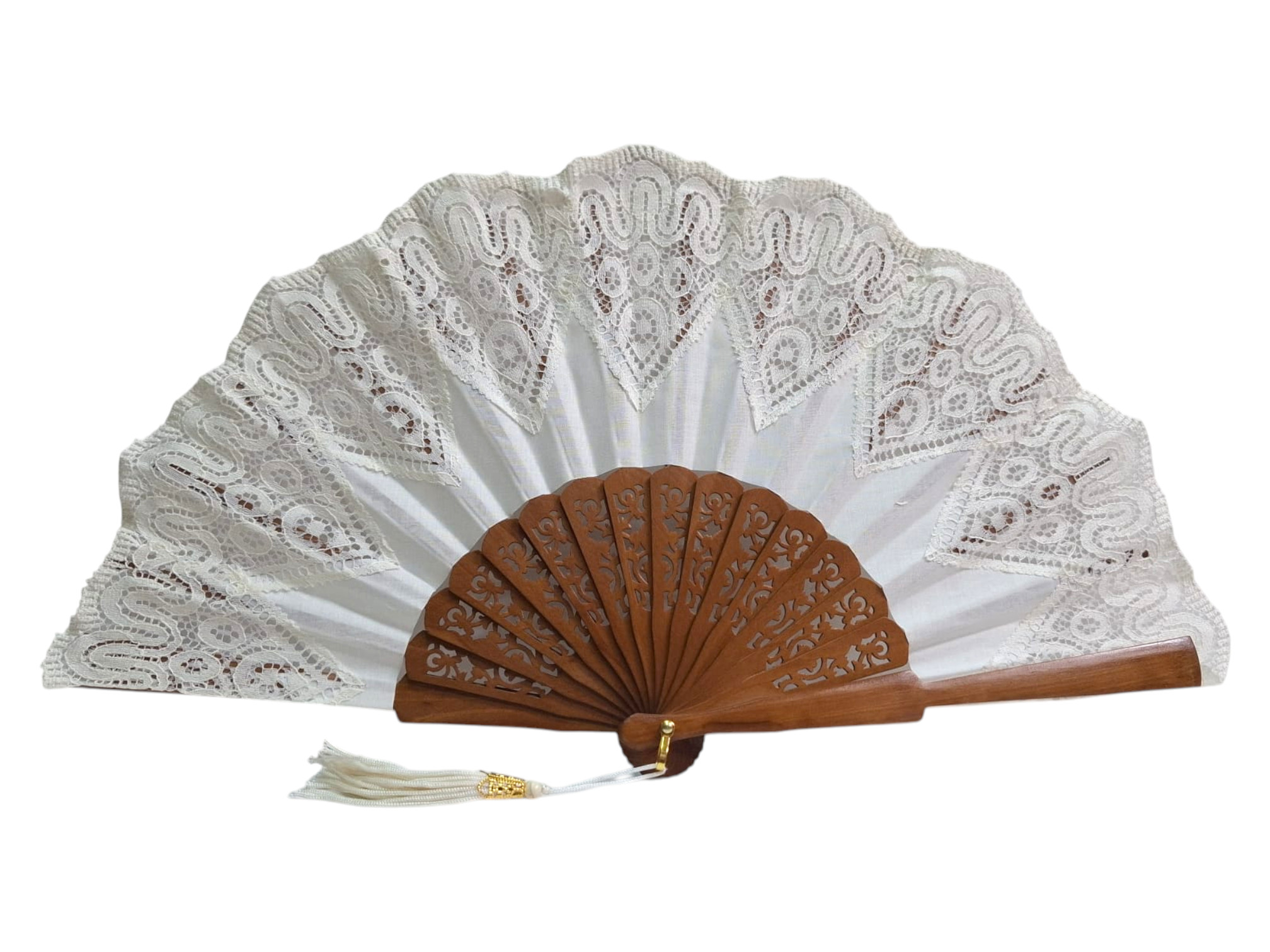 Abanico de ceremonia para novia de madera calada color avellana y encaje color marfil