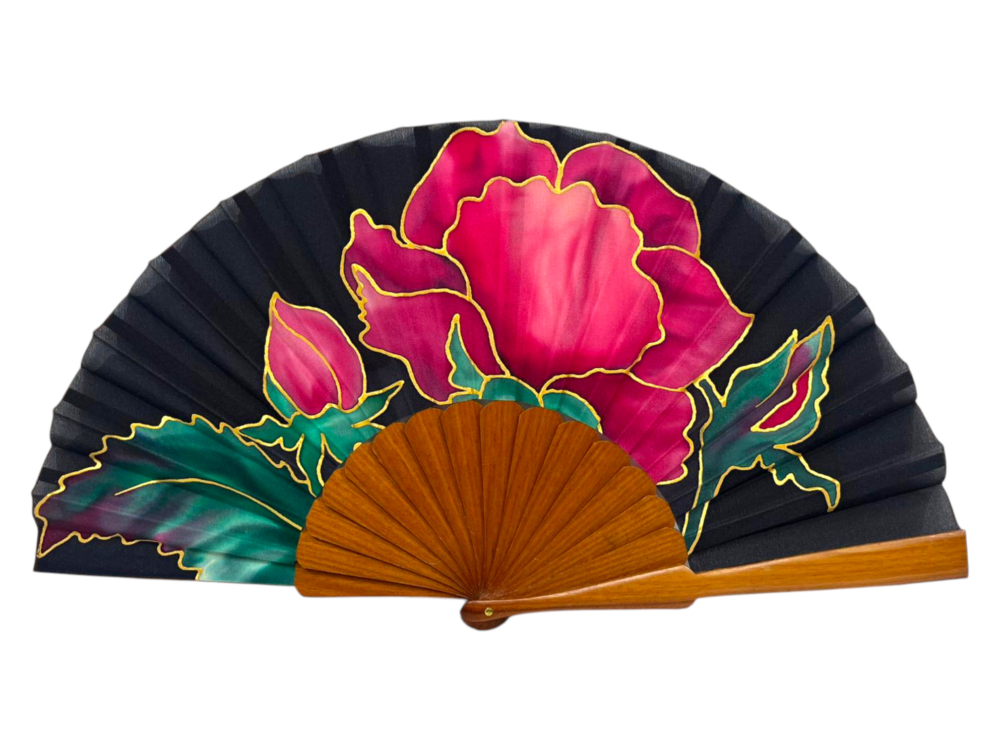 Abanico de seda natural pintada a mano con una espectacular flor en tonos fucsia y verdes, perfilada en dorado sobre fondo negro. Un diseño elegante, femenino y muy especial, perfecto para dar un toque sofisticado a cualquier look.