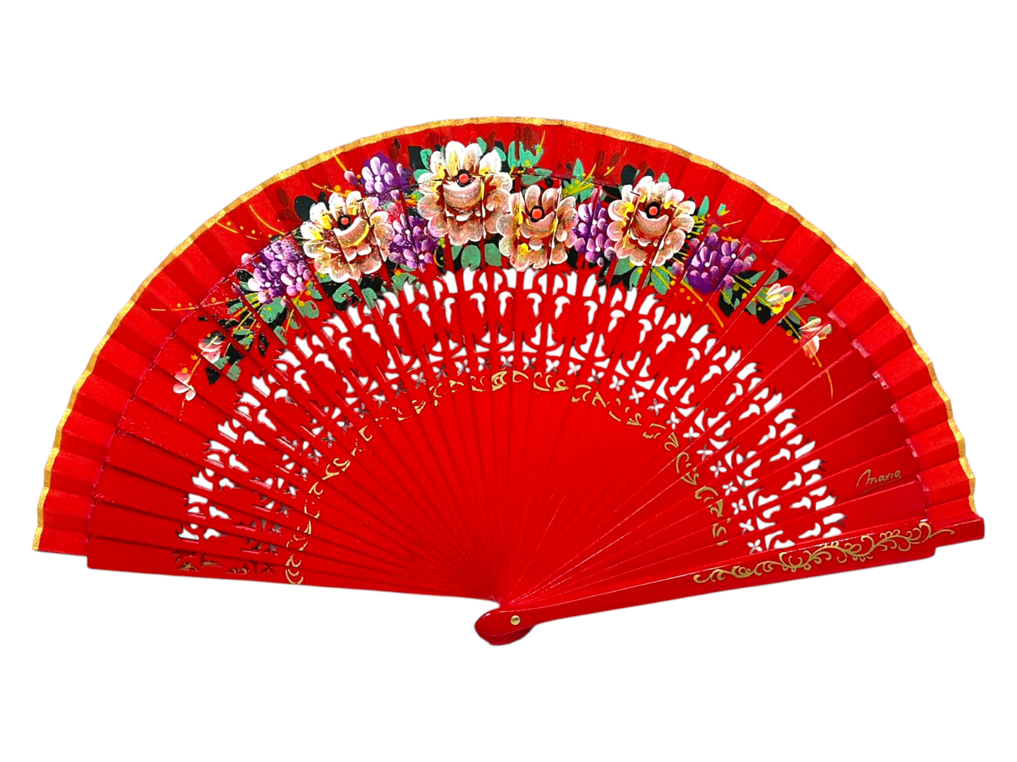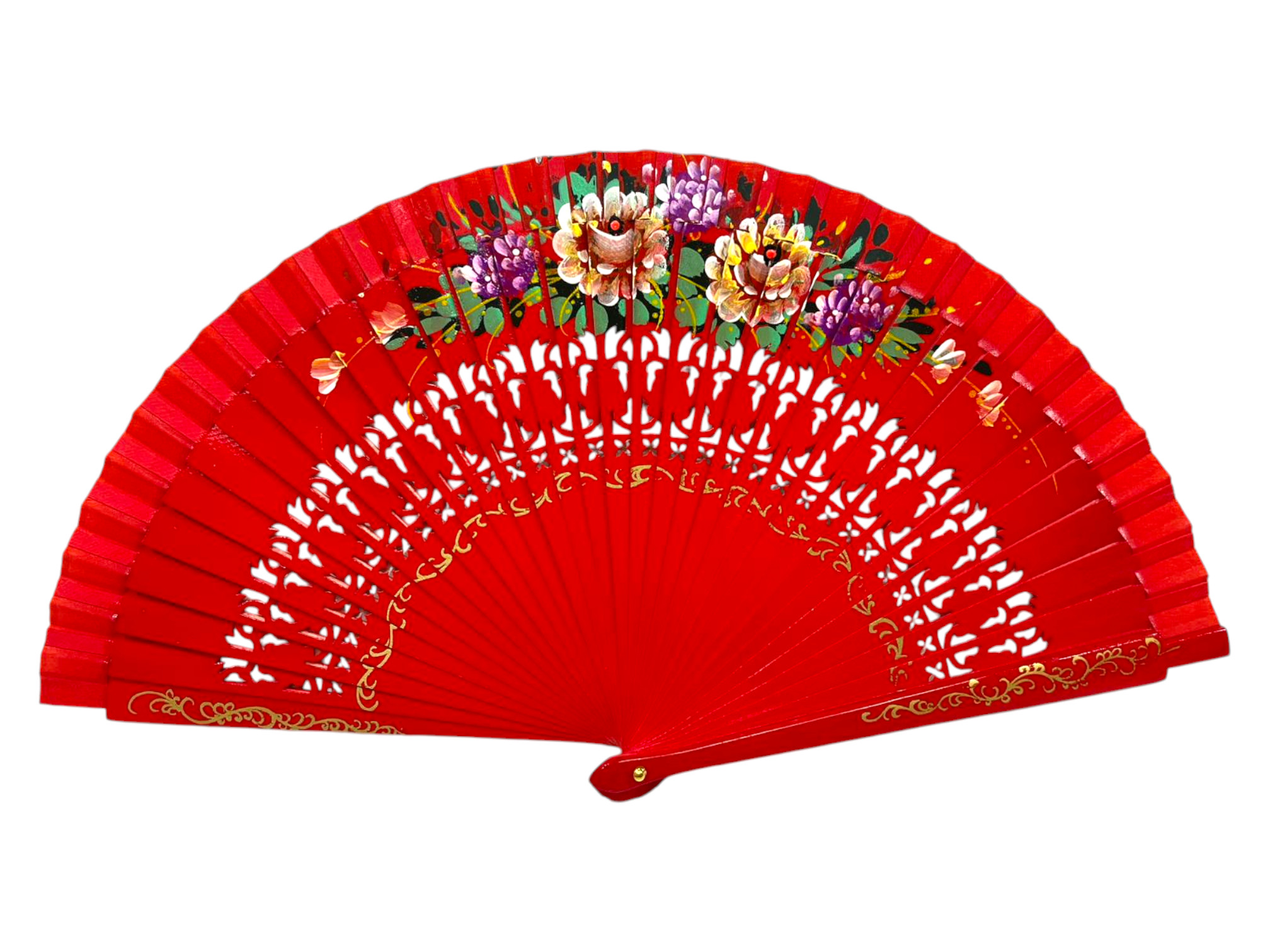 Estos abanicos son de una gran belleza, fabricados en madera y tela. El abanico es rojo y están pintadas unas bonitas flores.