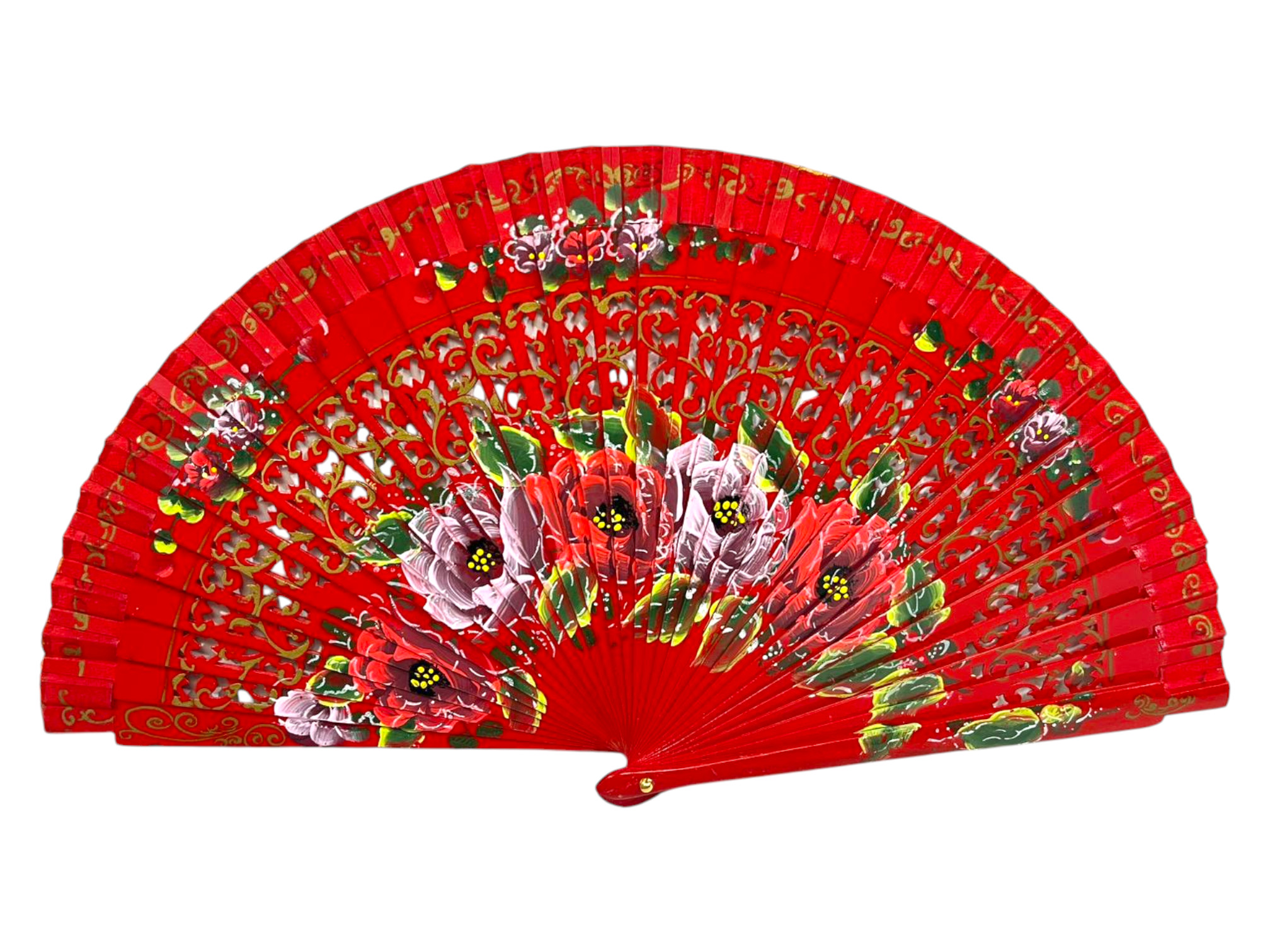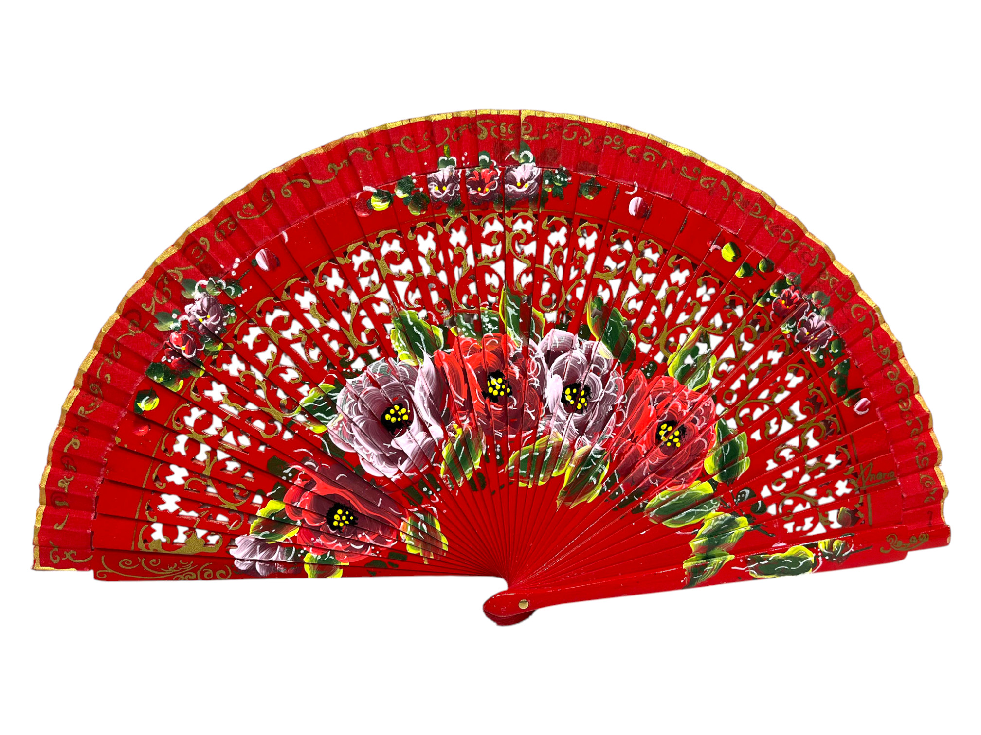 Abanico español de madera calada con diseño floral pintado a mano doble clara. Ref.1298RJ