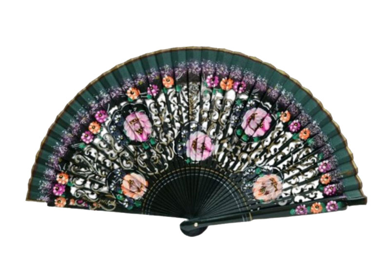 En un tono verde botella, decorado con flores pintadas a mano, es el accesorio perfecto para bodas, ferias, fiestas y celebraciones, además de ser práctico e imprescindible para los días calurosos.