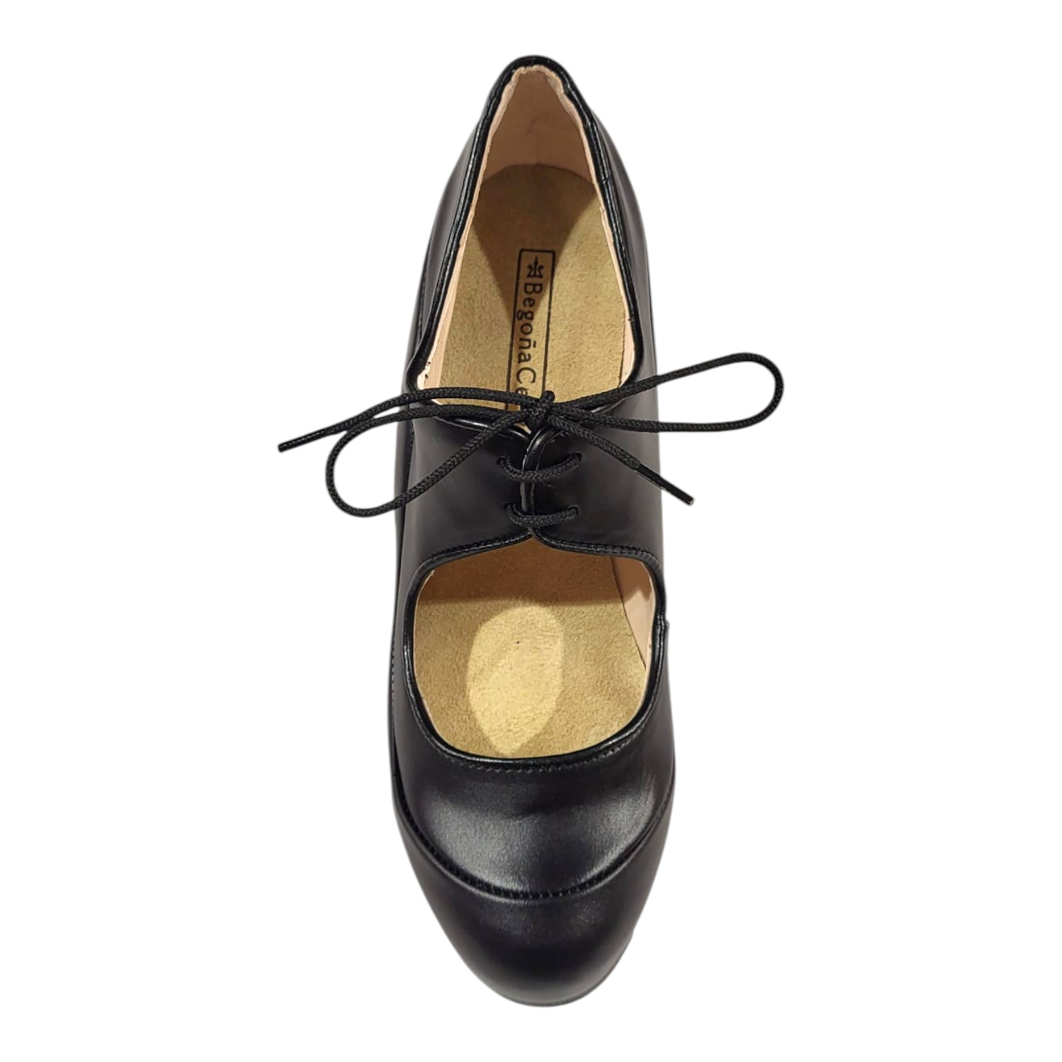 Modèle Angelito. Jolies chaussures de flamenco attachées avec des lacets et une ouverture ronde sur l'empeigne. Il s'agit d'une coupe élégante qui divise tout le contour de l'empeigne en deux parties.