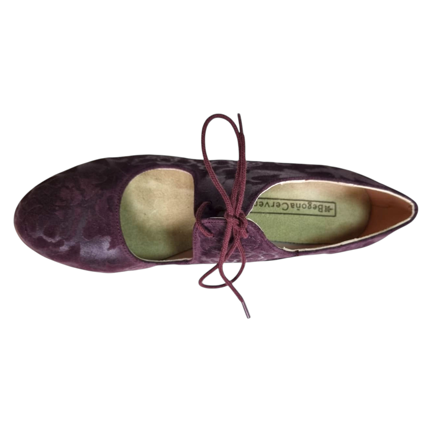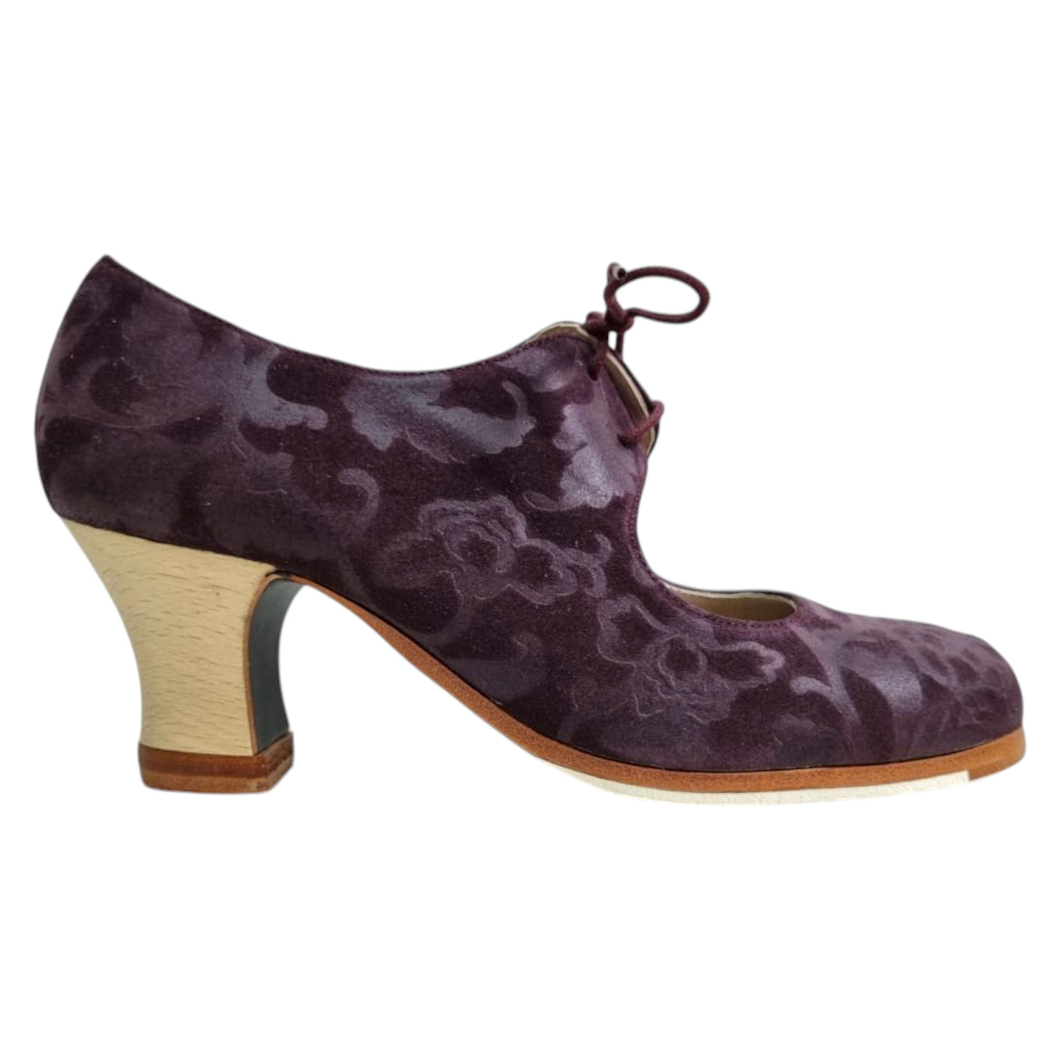 Zapato profesional de baile flamenco confeccionado artesanalmente por Begoña Cervera en una exclusiva piel Peonía color ciruela, con elegante relieve floral aterciopelado que aporta distinción y carácter.