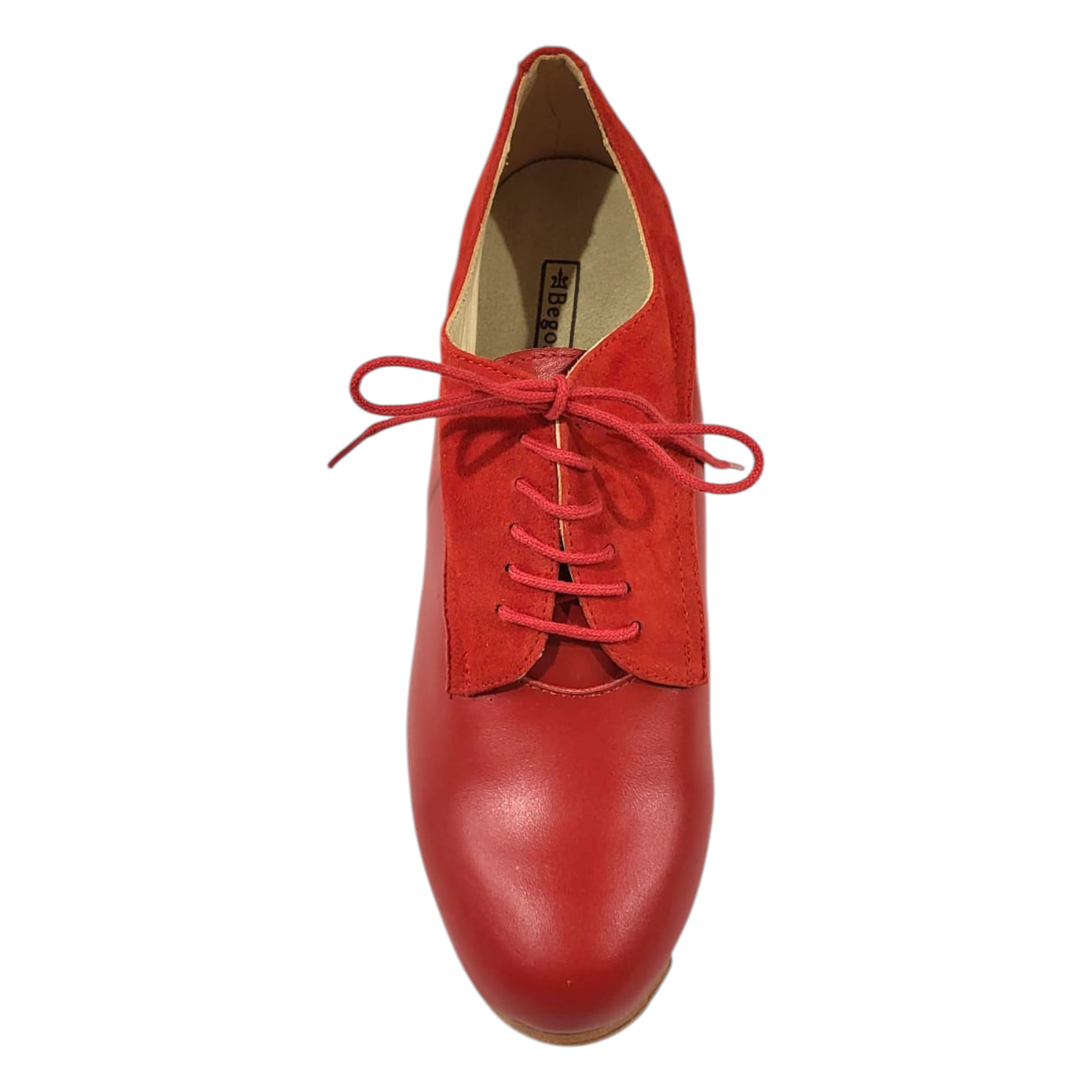 Modelo Blucher. Zapato profesional de baile flamenco con corte abotinado y abrochado con cordones. Tiene planta de cuero, filis con acabado antideslizante, suela y planta de cuero cosidos a mano, clavos en puntera y tacón y forro de piel.