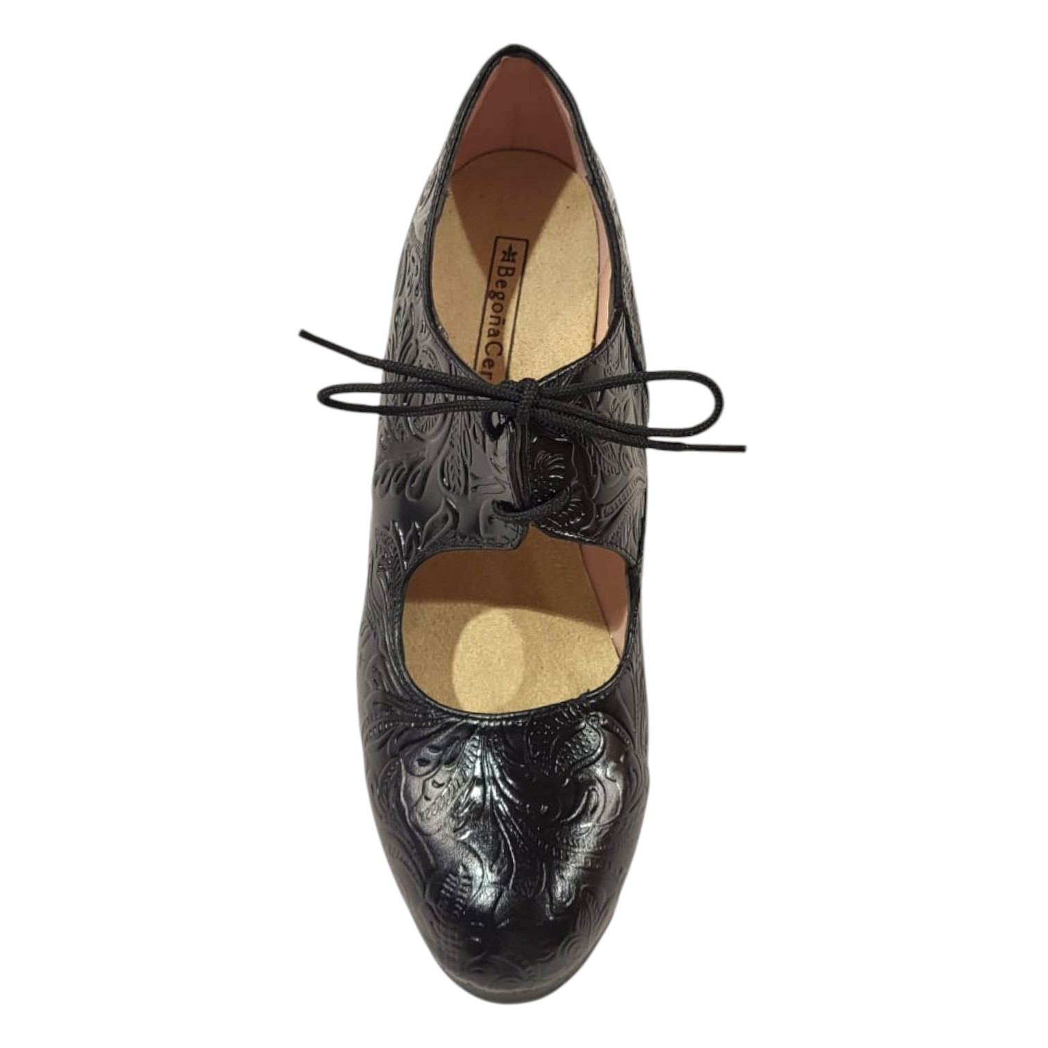 Maravilloso par de zapatos para el baile flamenco. El Modelo Cordonera está fabriado en ante, abrochado en la parte superior del empeine con un cordón. Tiene planta de cuero, filis con acabado antideslizante, suela y planta de cuero cosidos a mano, clavos en puntera y tacón y forro de piel.