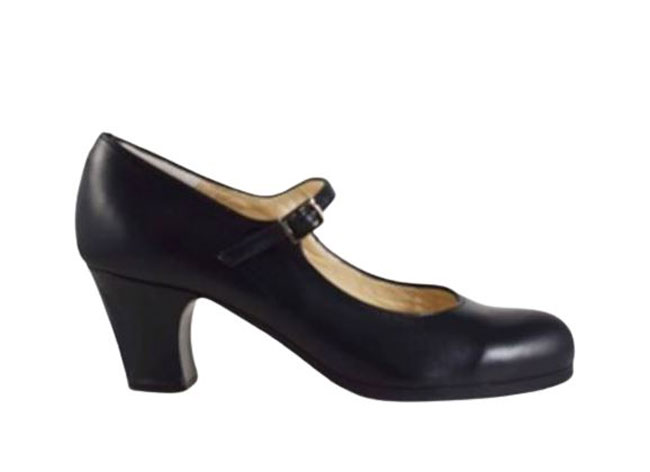 Zapato profesional para baile flamenco de diseño clásico y sencillo, tiene la punta redondeada y se sujeta con una correa con hebilla. Está elaborado con planta de cuero, filis con acabado antideslizante, suela y planta de cuero cosidos a mano, clavos en puntera y tacón y forro de piel.