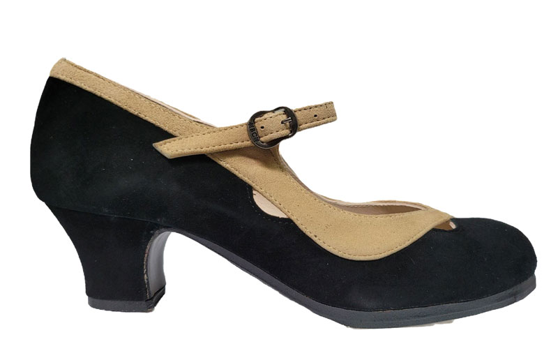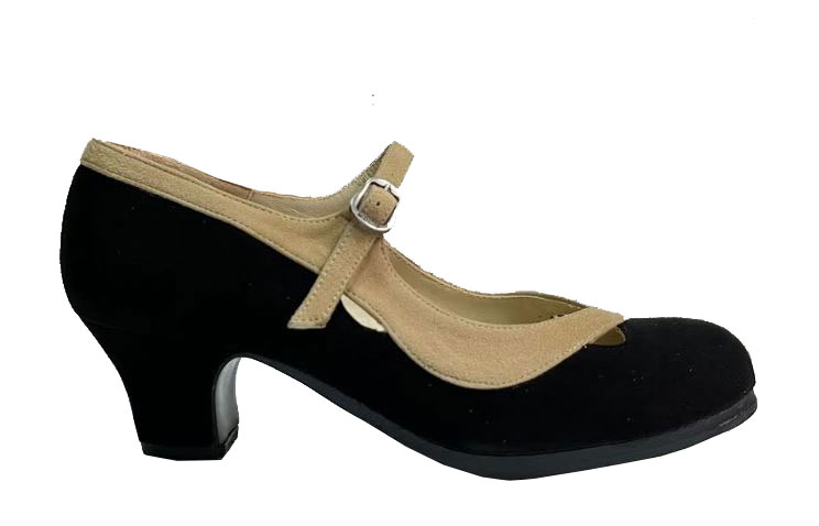 Espectacular zapato para baile flamenco en ante bicolor Salón Correa II. Tiene planta de cuero, filis con acabado antideslizante, suela y planta de cuero cosidos a mano, clavos en puntera y tacón y forro de piel.