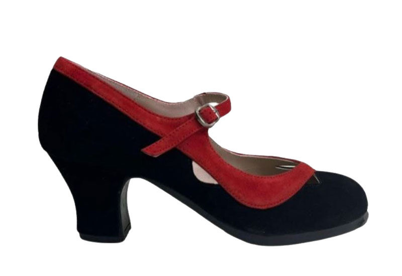 Espectacular zapato para baile flamenco en ante bicolor Salón Correa II. Tiene planta de cuero, filis con acabado antideslizante, suela y planta de cuero cosidos a mano, clavos en puntera y tacón y forro de piel.