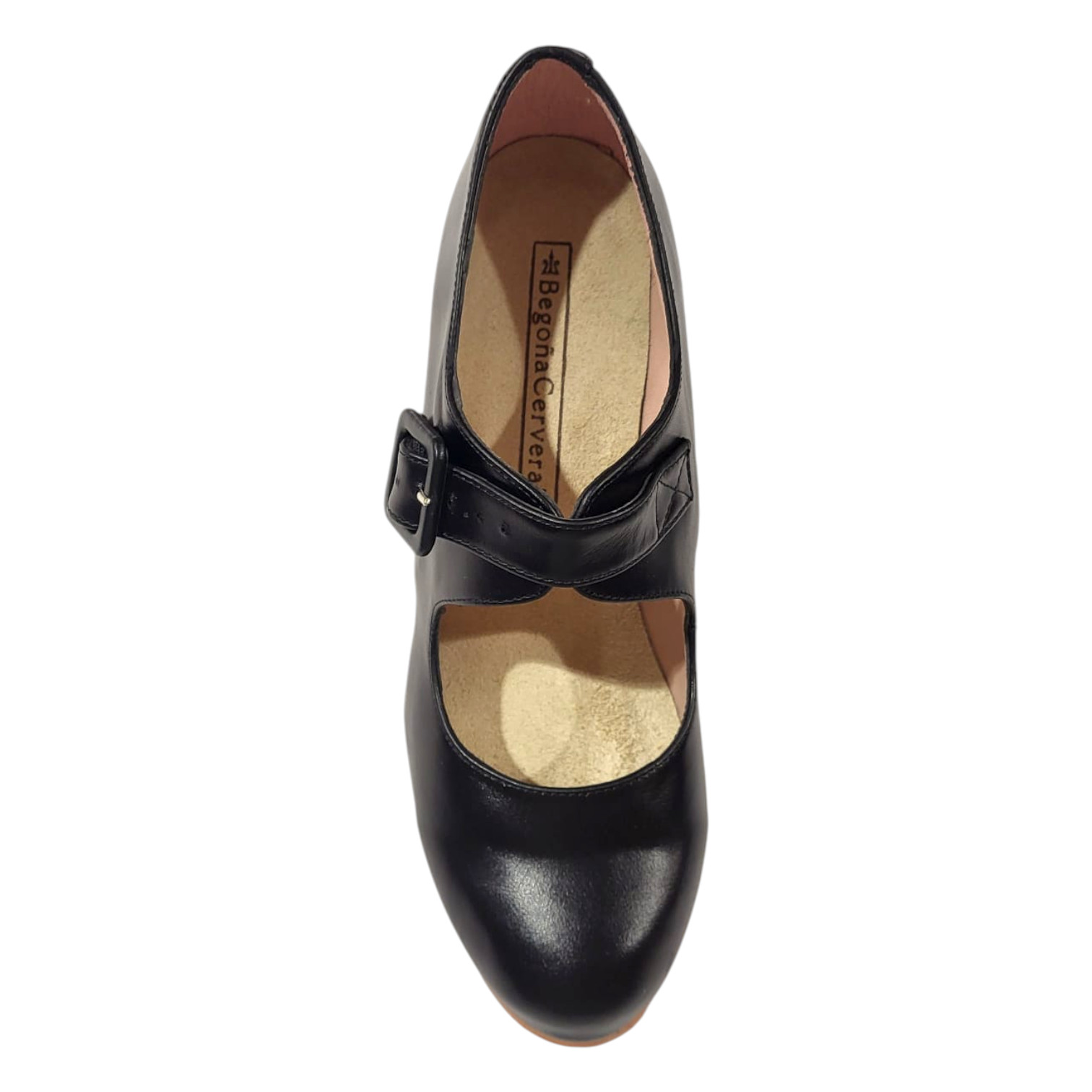 El zapato de baile flamenco Modelo Tablas es un modelo como el Correa pero cerrado en lo alto del empeine, y abrochado con una gran hebilla a un lado. Tiene planta de cuero, filis con acabado antideslizante, suela y planta de cuero cosidos a mano, clavos en puntera y tacón y forro de piel.