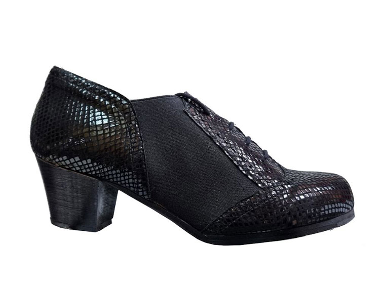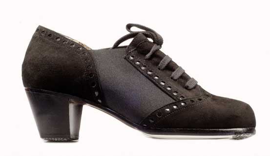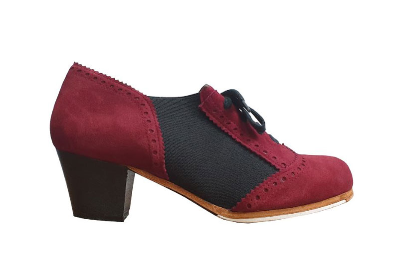 Chaussures de flamenco professionnelles avec une coupe en forme de bottine s'attachant avec des lacets. Cela permet au pied d'être parfaitement soutenu. Elles sont équipées de semelles en cuir, patins antiglisse (filis), clous sur la pointe et le talon ainsi qu'une doublure en cuir.