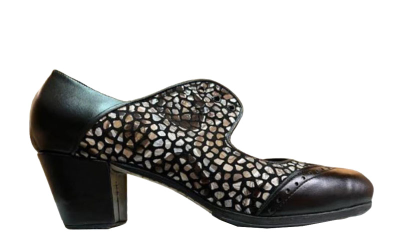 Gallardo ha realizado un nuevo diseño, el modelo Fátima. Zapato de línea clásica pero con correa y hebilla de un tamaño superior a lo normal y combinación en la puntera y trasera. Este modelo se puede combinar con materiales de fantasía para darle más vistosidad. Fabricado en piel de bovino de primera calidad, filis antideslizantes y numerosos clavos en punta y tacón.