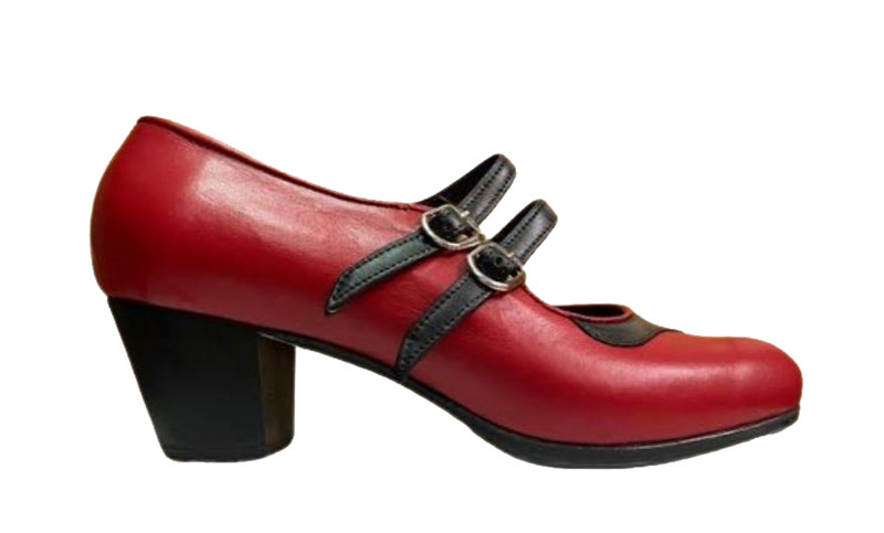 Zapato de flamenco que se abrocha con dos correas situadas de forma paralela. Fabricado en piel bovina de primera calidad, lleva filis antideslizantes y numerosos clavos en punta y tacón.