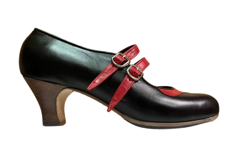 Zapato de flamenco que se abrocha con dos correas situadas de forma paralela. Fabricado en piel bovina de primera calidad, lleva filis antideslizantes y numerosos clavos en punta y tacón.
