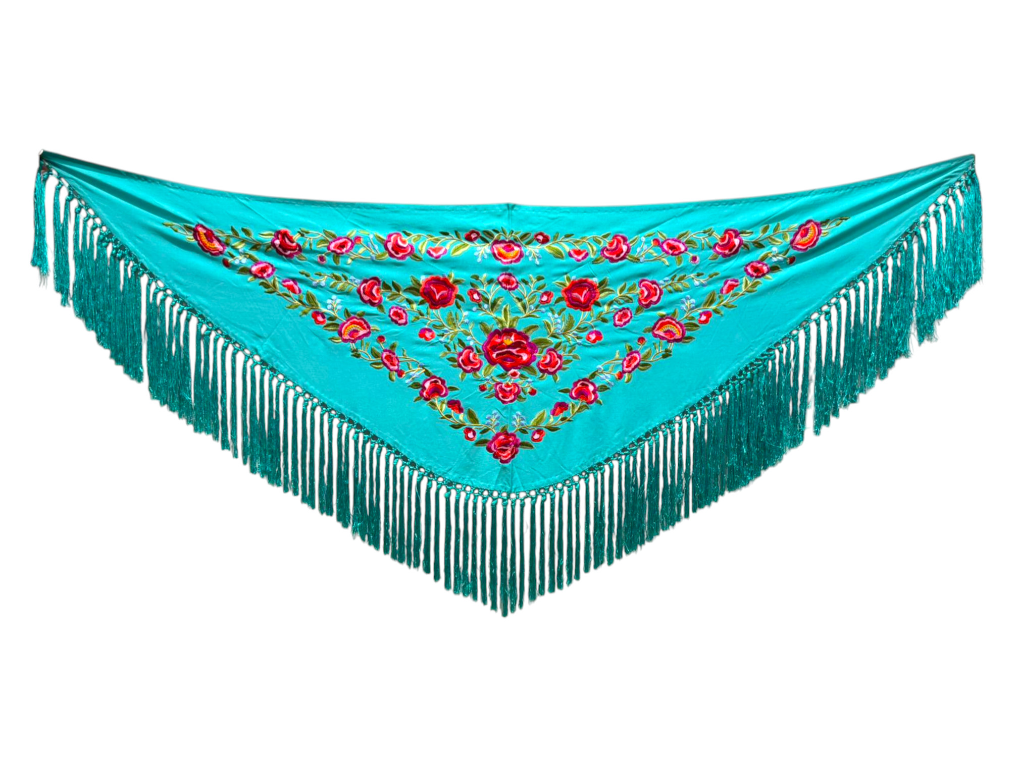 Está rematado con flecado de seda anudado a mano, que aporta movimiento, caída y un acabado tradicional de gran calidad. Fabricado íntegramente en España, es un mantoncillo económico, ideal tanto para feria, romerías, espectáculos o uso profesional.
