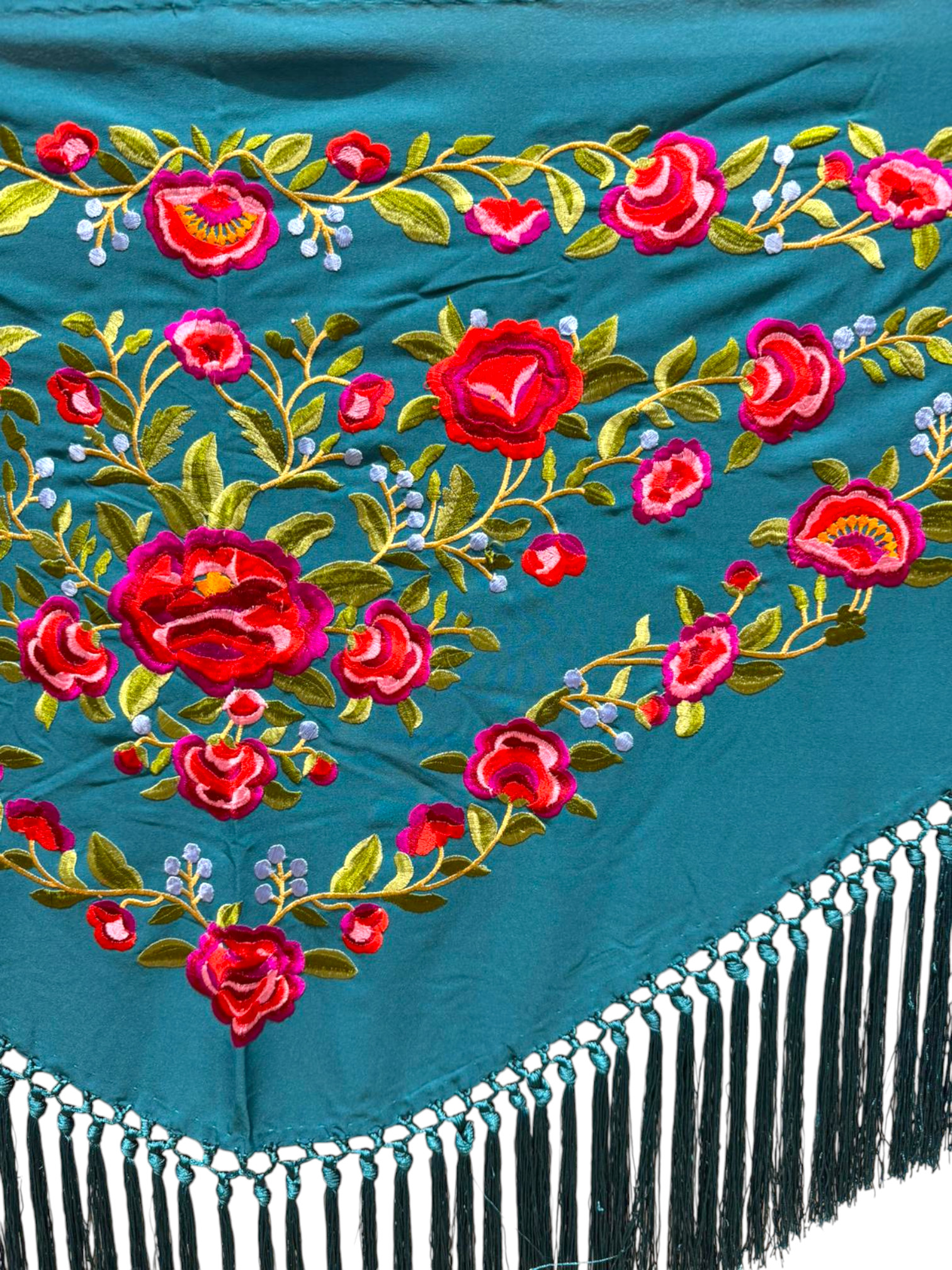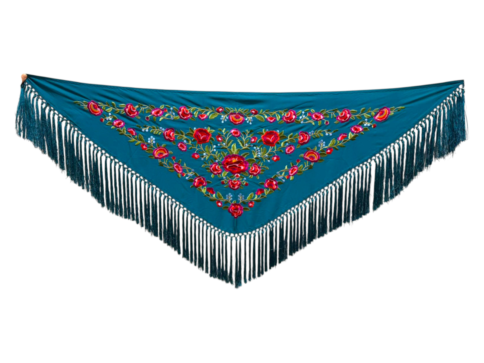 Está rematado con flecado de seda anudado a mano, que aporta movimiento, caída y un acabado tradicional de gran calidad. Fabricado íntegramente en España, es un mantoncillo económico, ideal tanto para feria, romerías, espectáculos o uso profesional.