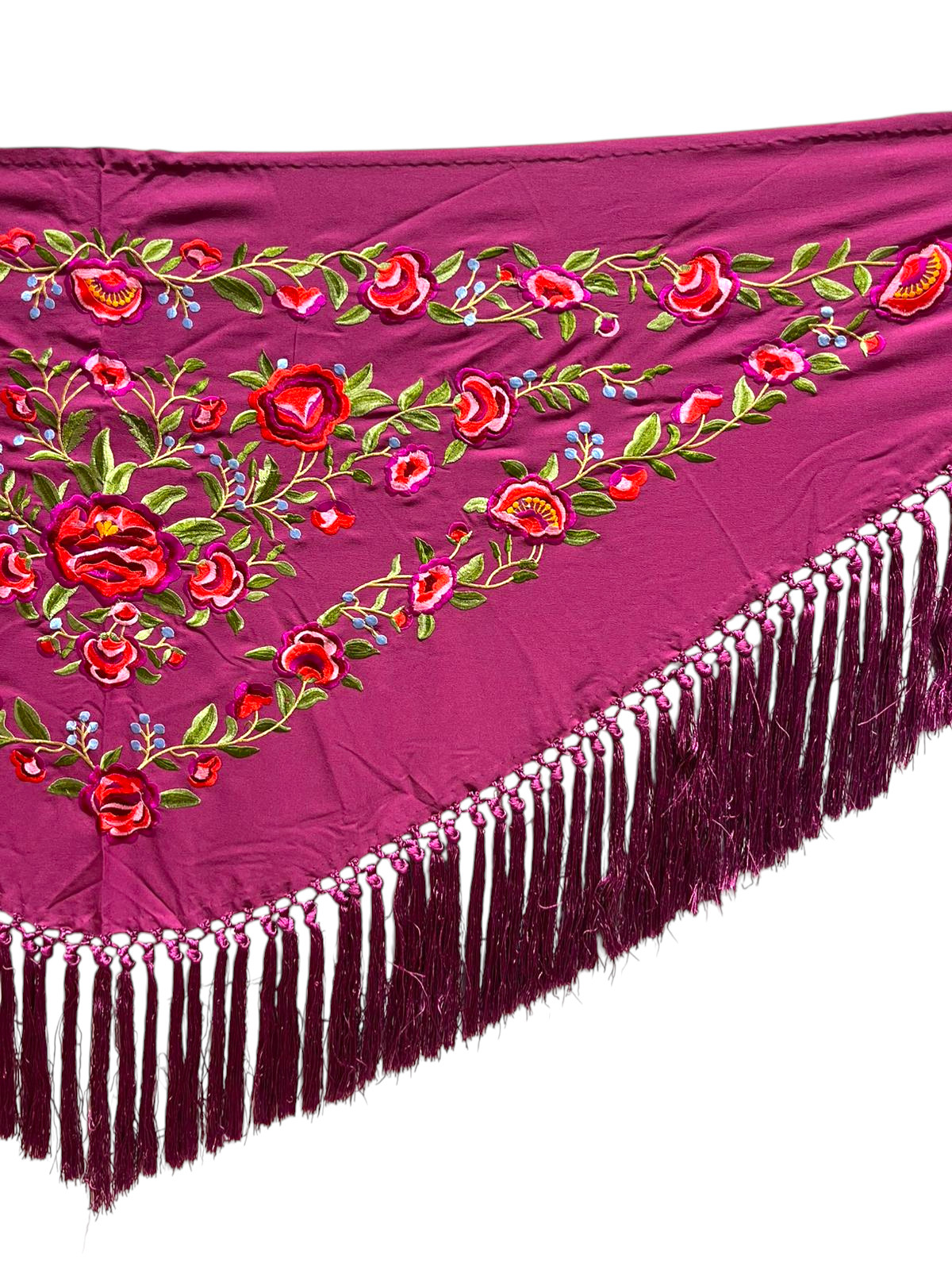 Está rematado con flecado de seda anudado a mano, que aporta movimiento, caída y un acabado tradicional de gran calidad. Fabricado íntegramente en España, es un mantoncillo económico, ideal tanto para feria, romerías, espectáculos o uso profesional.