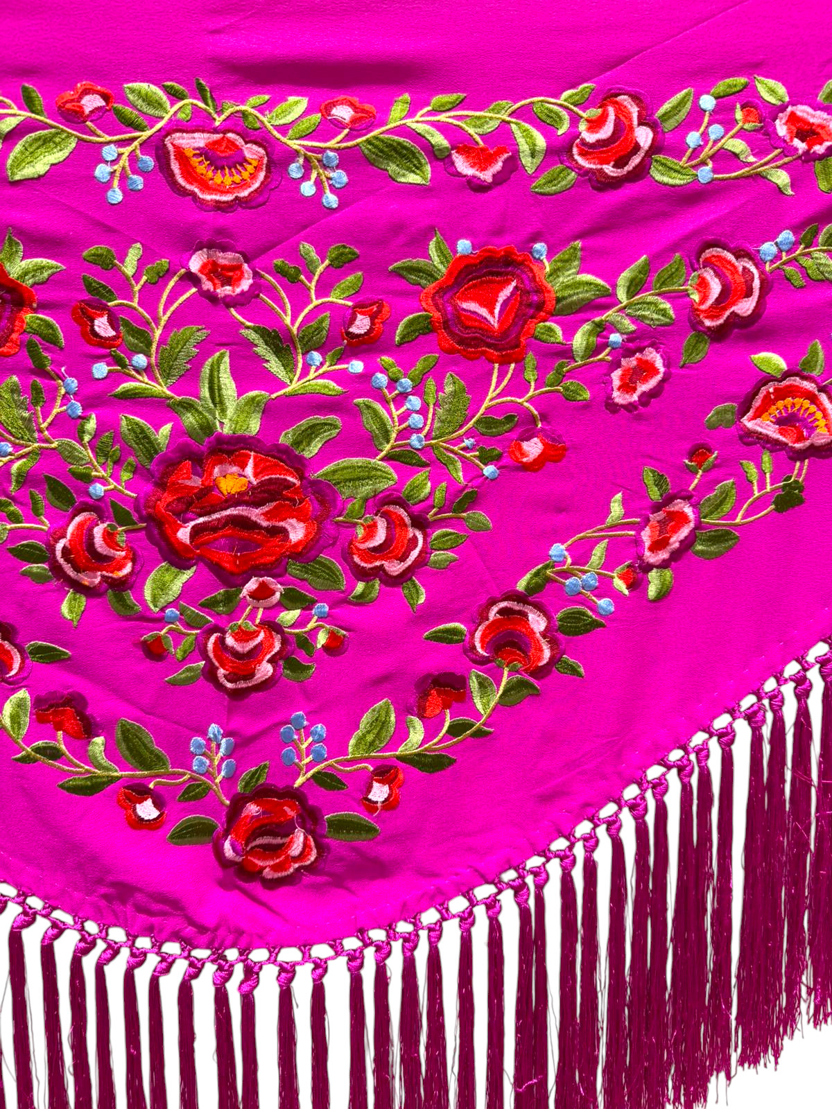 Está rematado con flecado de seda anudado a mano, que aporta movimiento, caída y un acabado tradicional de gran calidad. Fabricado íntegramente en España, es un mantoncillo económico, ideal tanto para feria, romerías, espectáculos o uso profesional.