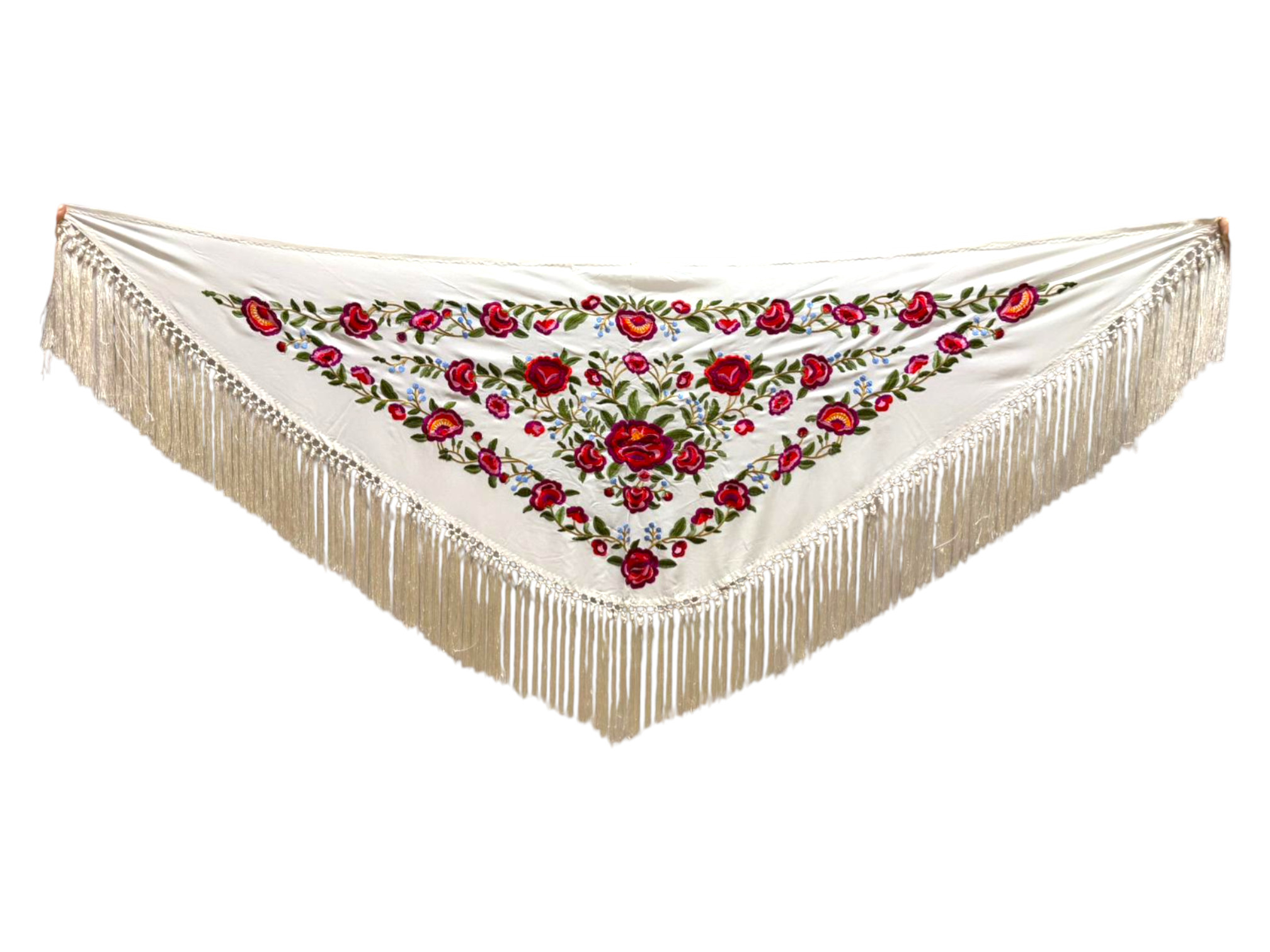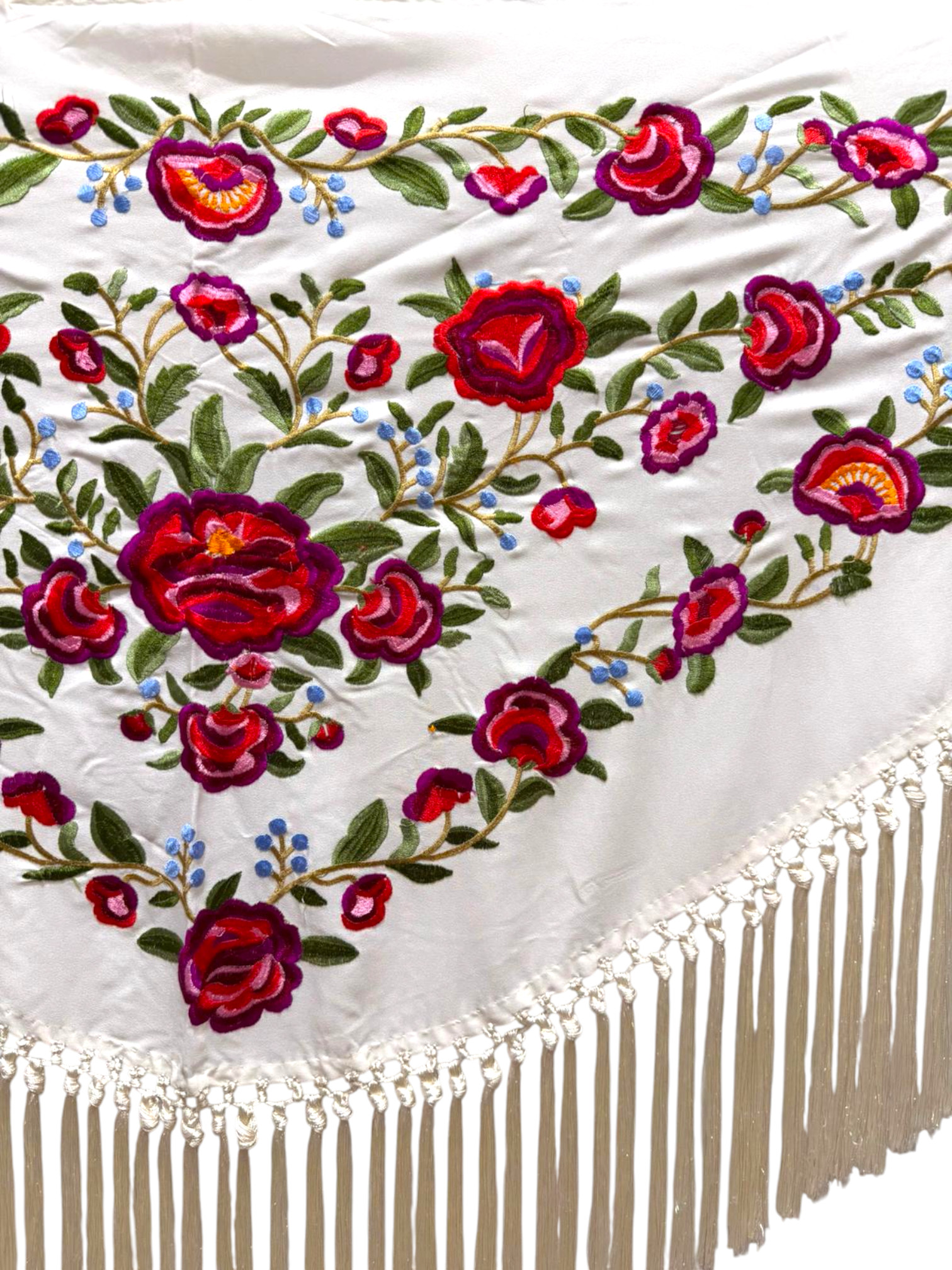Está rematado con flecado de seda anudado a mano, que aporta movimiento, caída y un acabado tradicional de gran calidad. Fabricado íntegramente en España, es un mantoncillo económico, ideal tanto para feria, romerías, espectáculos o uso profesional.