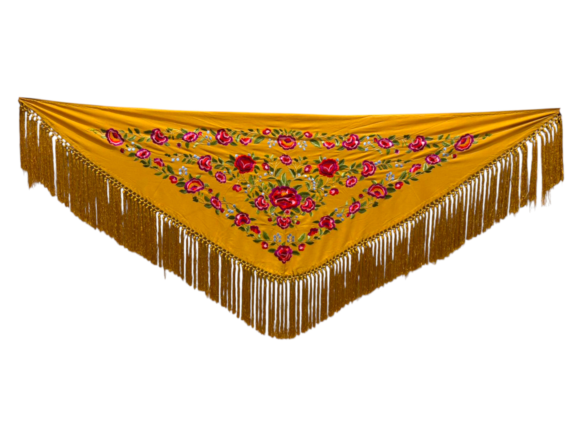 Está rematado con flecado de seda anudado a mano, que aporta movimiento, caída y un acabado tradicional de gran calidad. Fabricado íntegramente en España, es un mantoncillo económico, ideal tanto para feria, romerías, espectáculos o uso profesional.