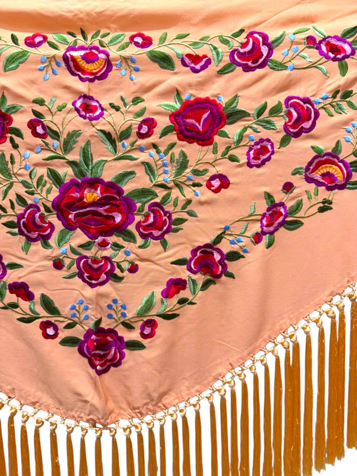 Mantoncillo de flamenca modelo Peonía, bordado a máquina con un delicado diseño floral de inspiración clásica. El bordado es siempre el mismo que el mostrado en la imagen; lo que varía es el color de la tela base, disponible en una amplia gama de tonos para adaptarse a cualquier traje de flamenca o estilismo.