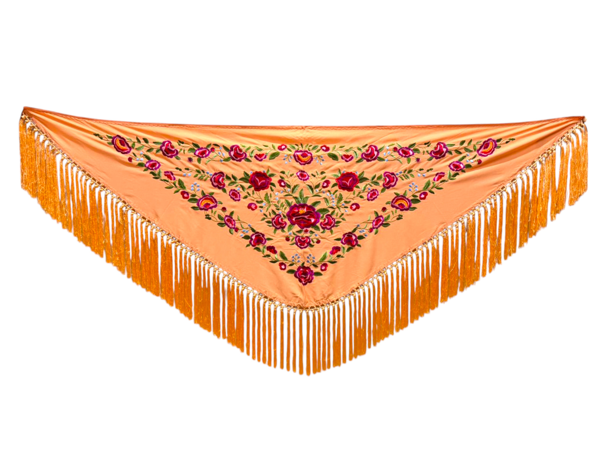 Está rematado con flecado de seda anudado a mano, que aporta movimiento, caída y un acabado tradicional de gran calidad. Fabricado íntegramente en España, es un mantoncillo económico, ideal tanto para feria, romerías, espectáculos o uso profesional.