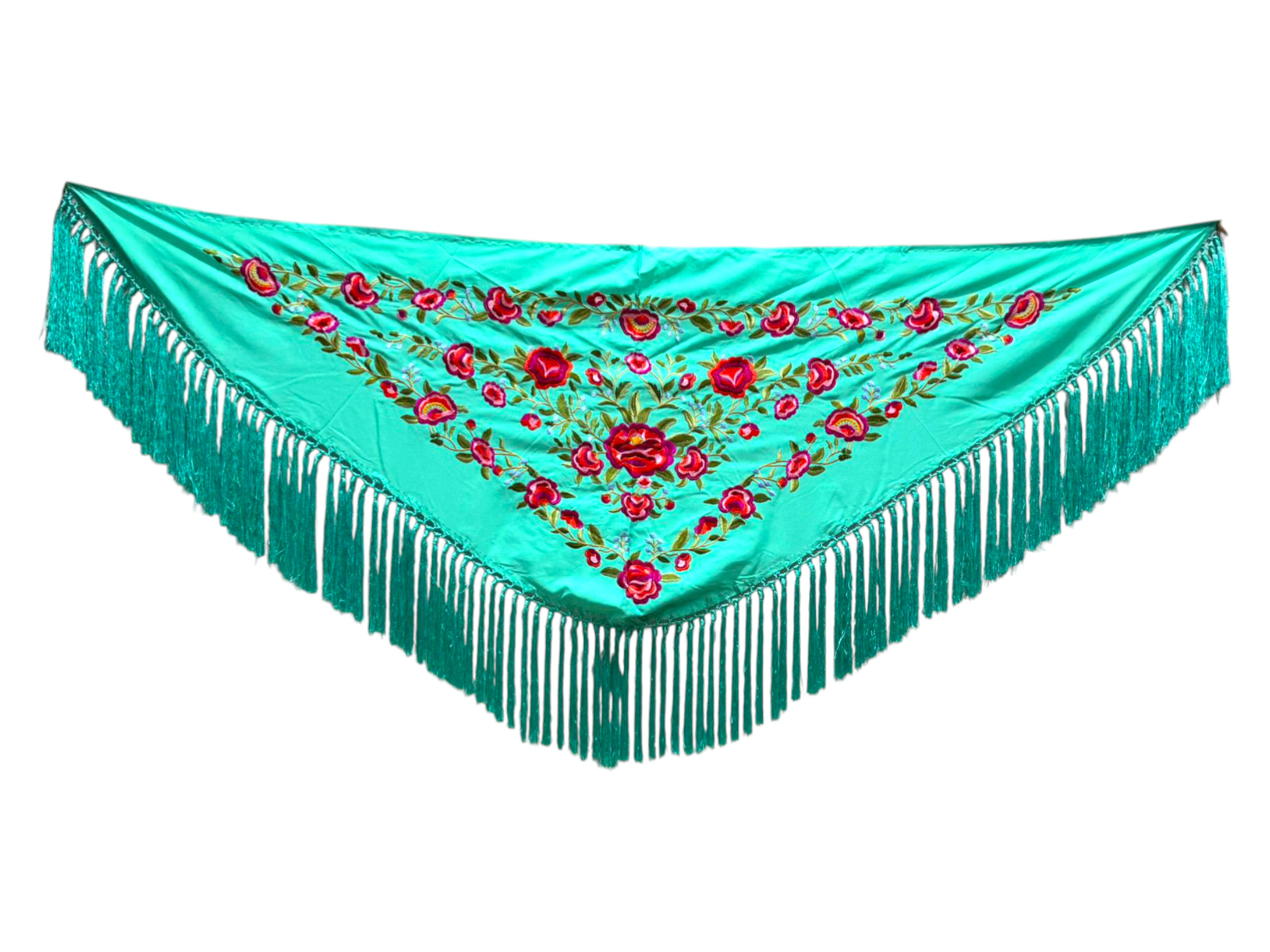 Está rematado con flecado de seda anudado a mano, que aporta movimiento, caída y un acabado tradicional de gran calidad. Fabricado íntegramente en España, es un mantoncillo económico, ideal tanto para feria, romerías, espectáculos o uso profesional.
