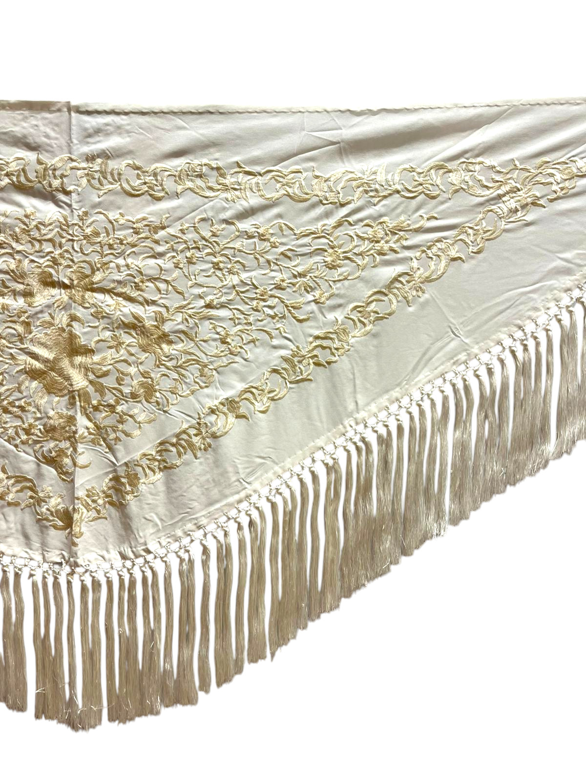 Está rematado con flecado de seda anudado a mano, que aporta movimiento, caída y un acabado tradicional de gran calidad. Fabricado íntegramente en España, es un mantoncillo económico que mantiene la esencia del complemento flamenco clásico.