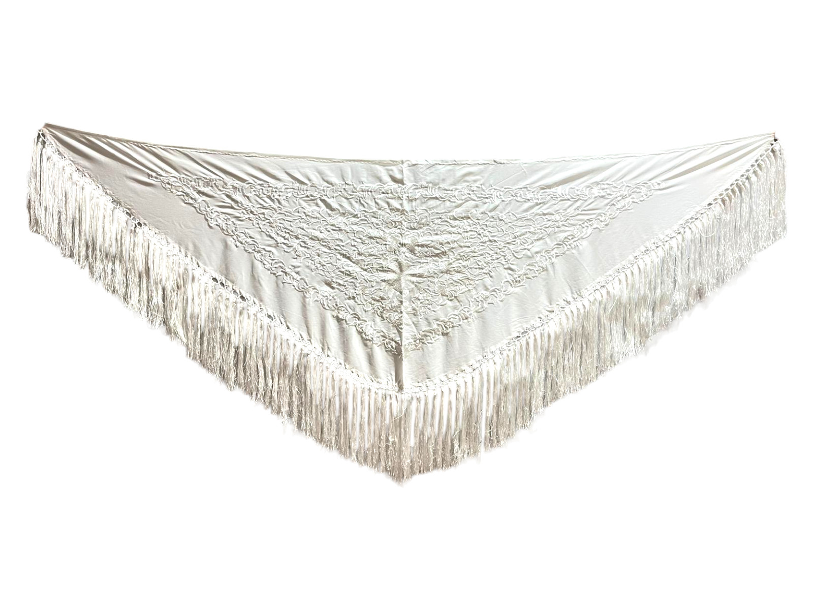 Está rematado con flecado de seda anudado a mano, que aporta movimiento, caída y un acabado tradicional de gran calidad. Fabricado íntegramente en España, es un mantoncillo económico que mantiene la esencia del complemento flamenco clásico.