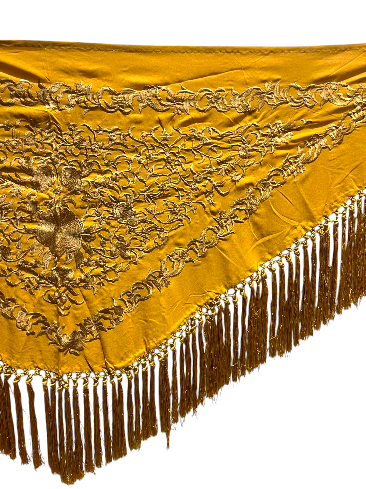 Está rematado con flecado de seda anudado a mano, que aporta movimiento, caída y un acabado tradicional de gran calidad. Fabricado íntegramente en España, es un mantoncillo económico que mantiene la esencia del complemento flamenco clásico.