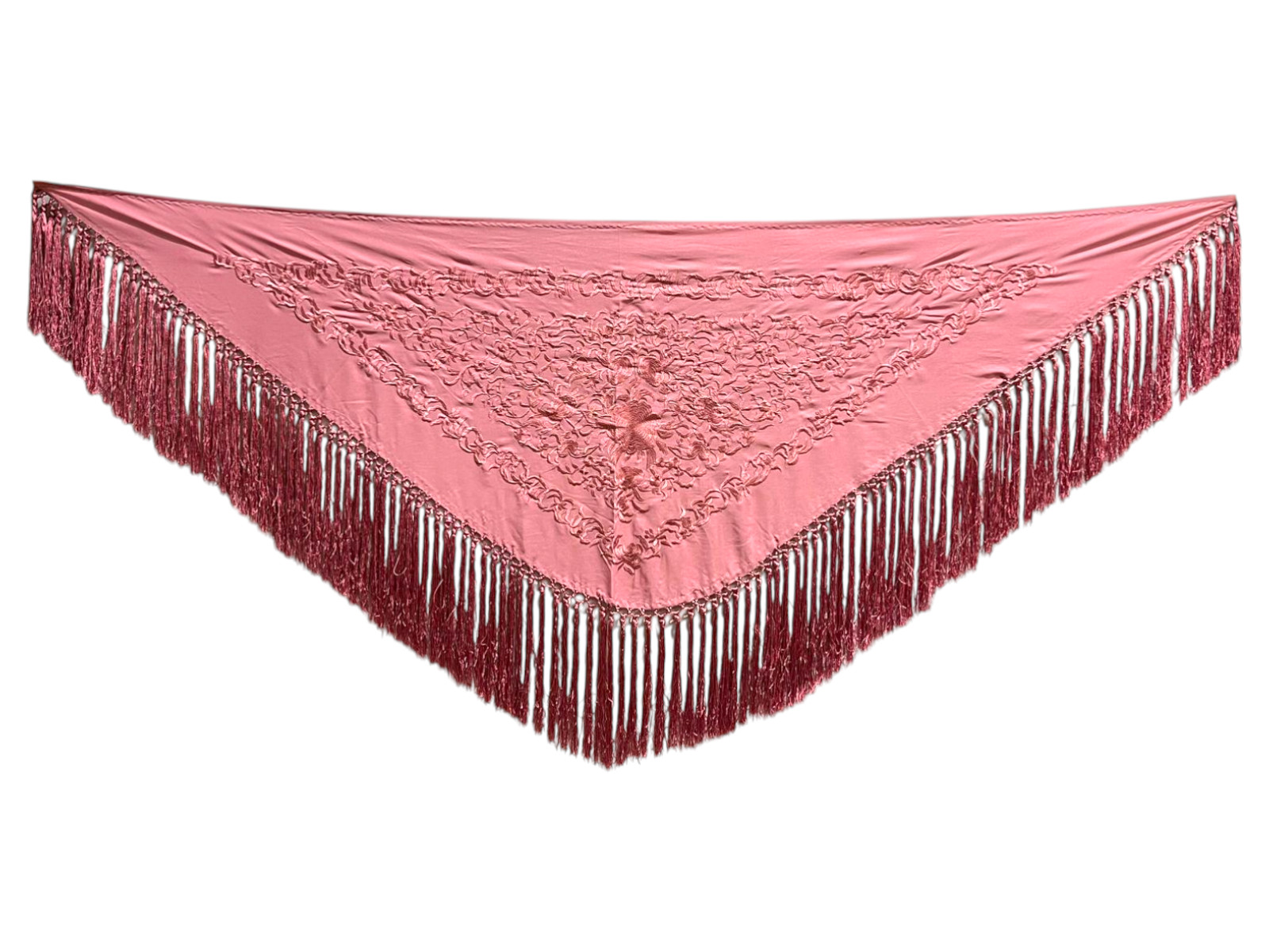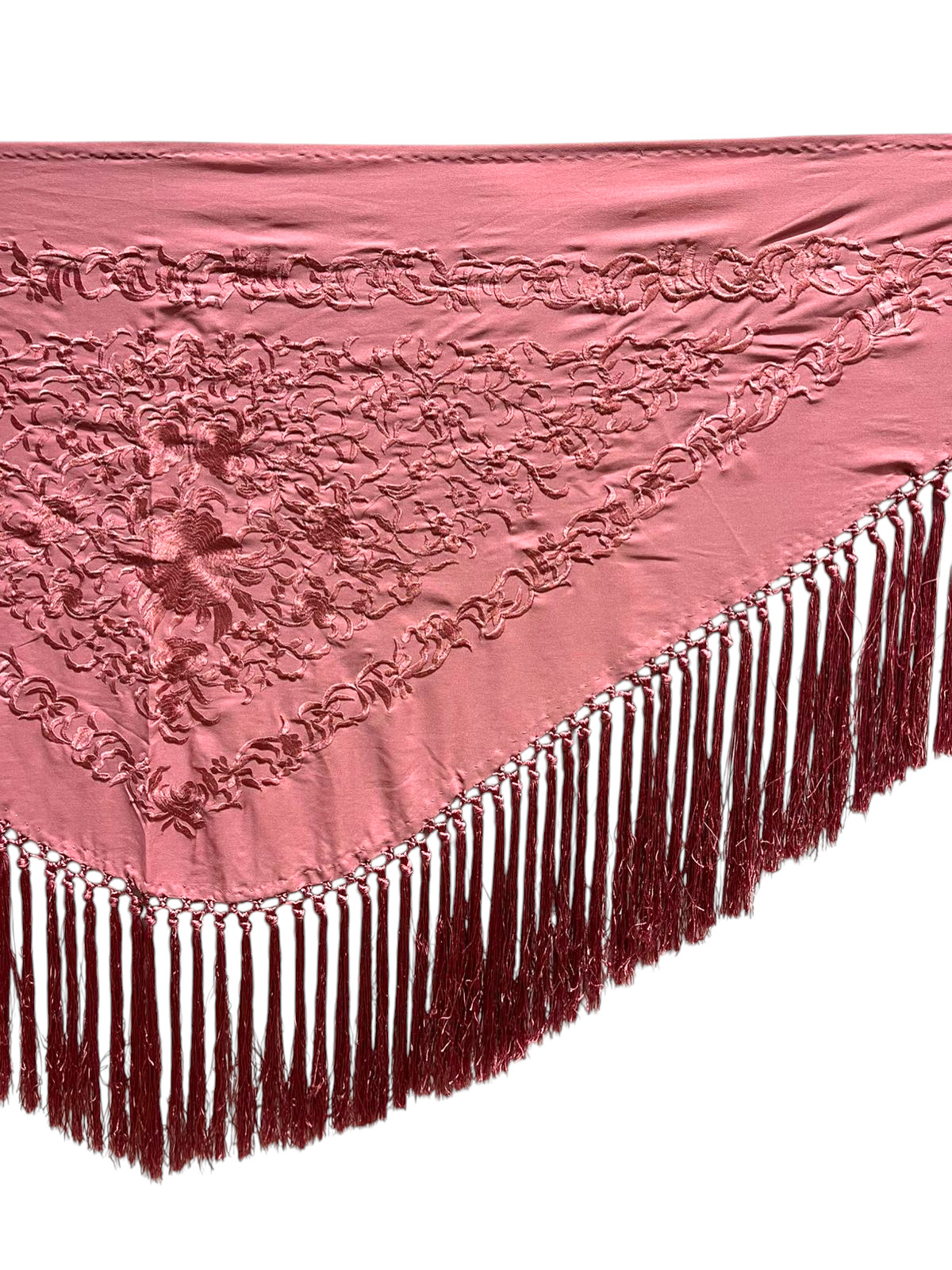 Está rematado con flecado de seda anudado a mano, que aporta movimiento, caída y un acabado tradicional de gran calidad. Fabricado íntegramente en España, es un mantoncillo económico que mantiene la esencia del complemento flamenco clásico.