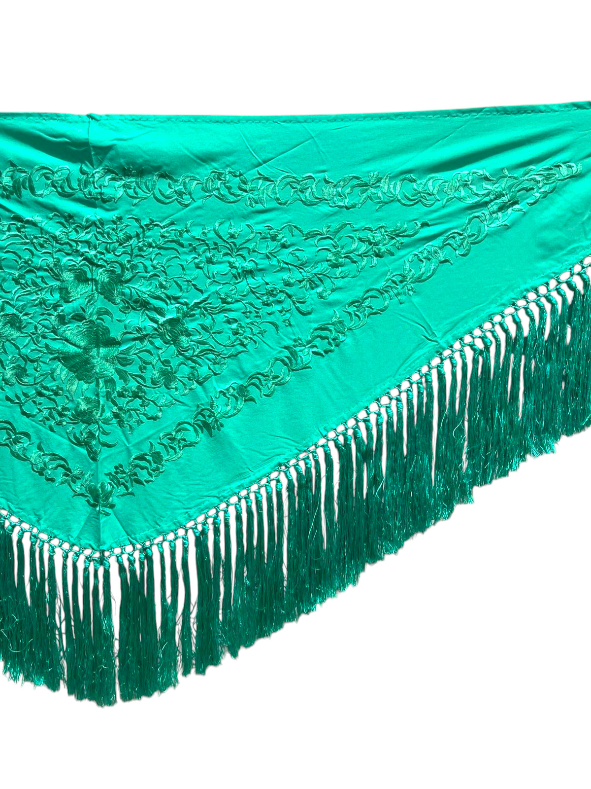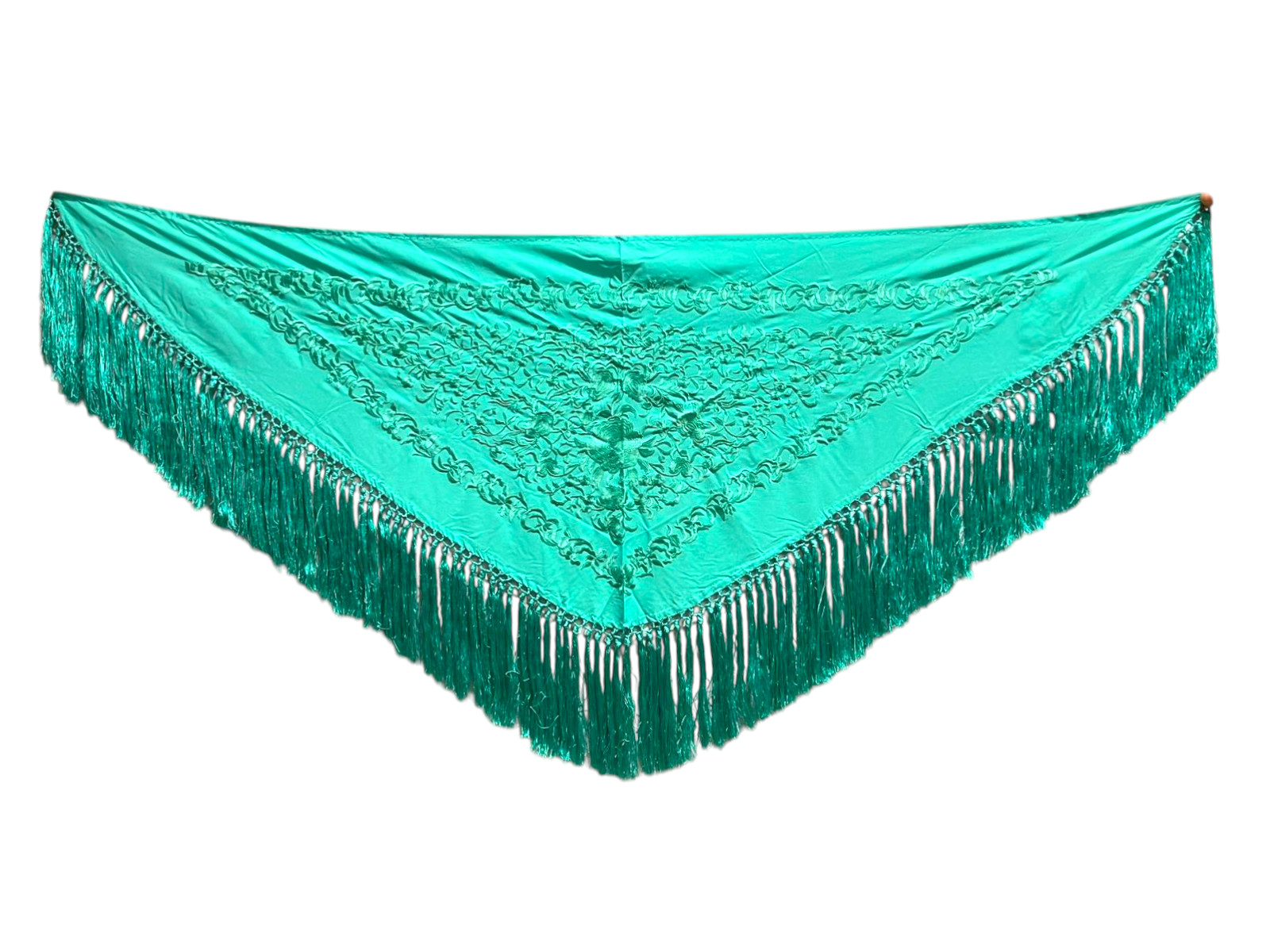 Está rematado con flecado de seda anudado a mano, que aporta movimiento, caída y un acabado tradicional de gran calidad. Fabricado íntegramente en España, es un mantoncillo económico que mantiene la esencia del complemento flamenco clásico.