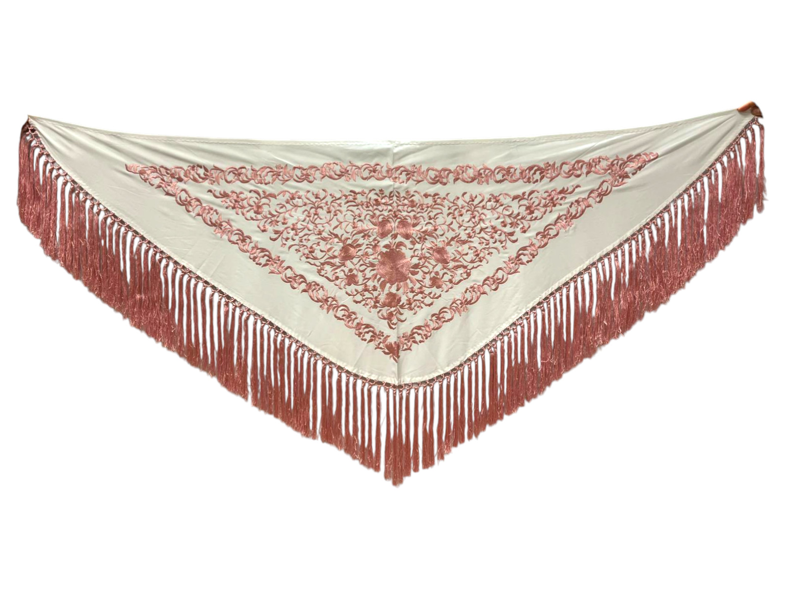 El flecado de seda, anudado a mano y en el mismo tono que el bordado, refuerza la armonía del diseño y aporta un acabado tradicional de gran calidad. Gracias a su fluidez y ligereza, este mantoncillo es ideal para realzar cada movimiento, tanto en baile como en feria o eventos.