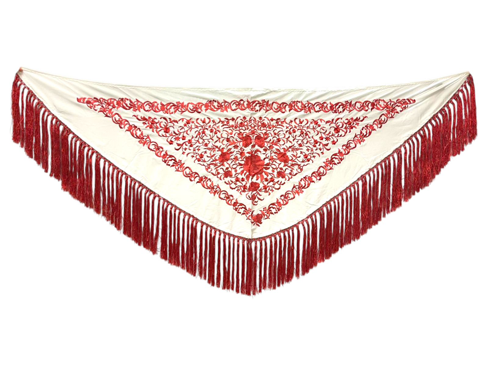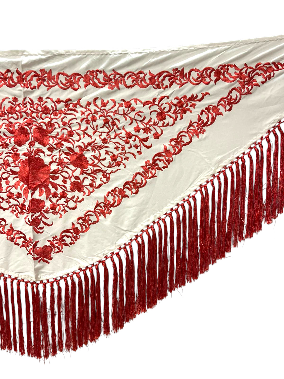 El flecado de seda, anudado a mano y en el mismo tono que el bordado, refuerza la armonía del diseño y aporta un acabado tradicional de gran calidad. Gracias a su fluidez y ligereza, este mantoncillo es ideal para realzar cada movimiento, tanto en baile como en feria o eventos.