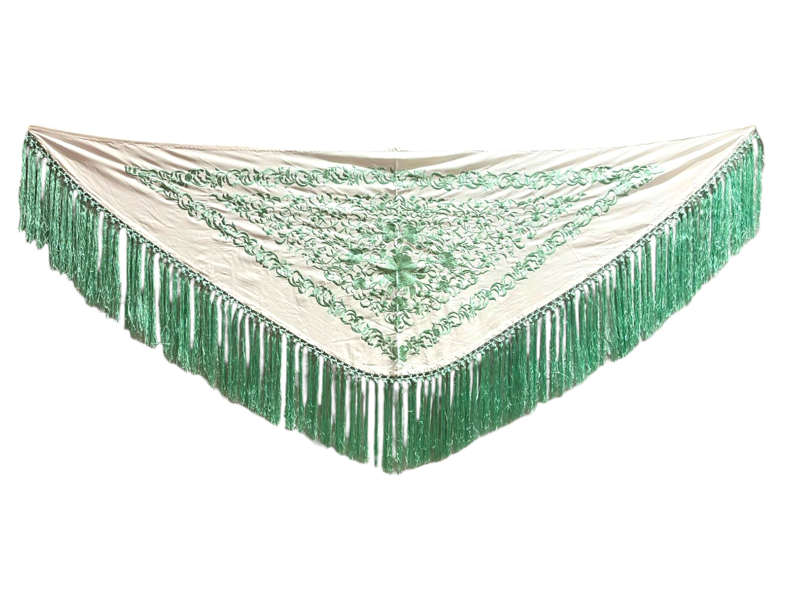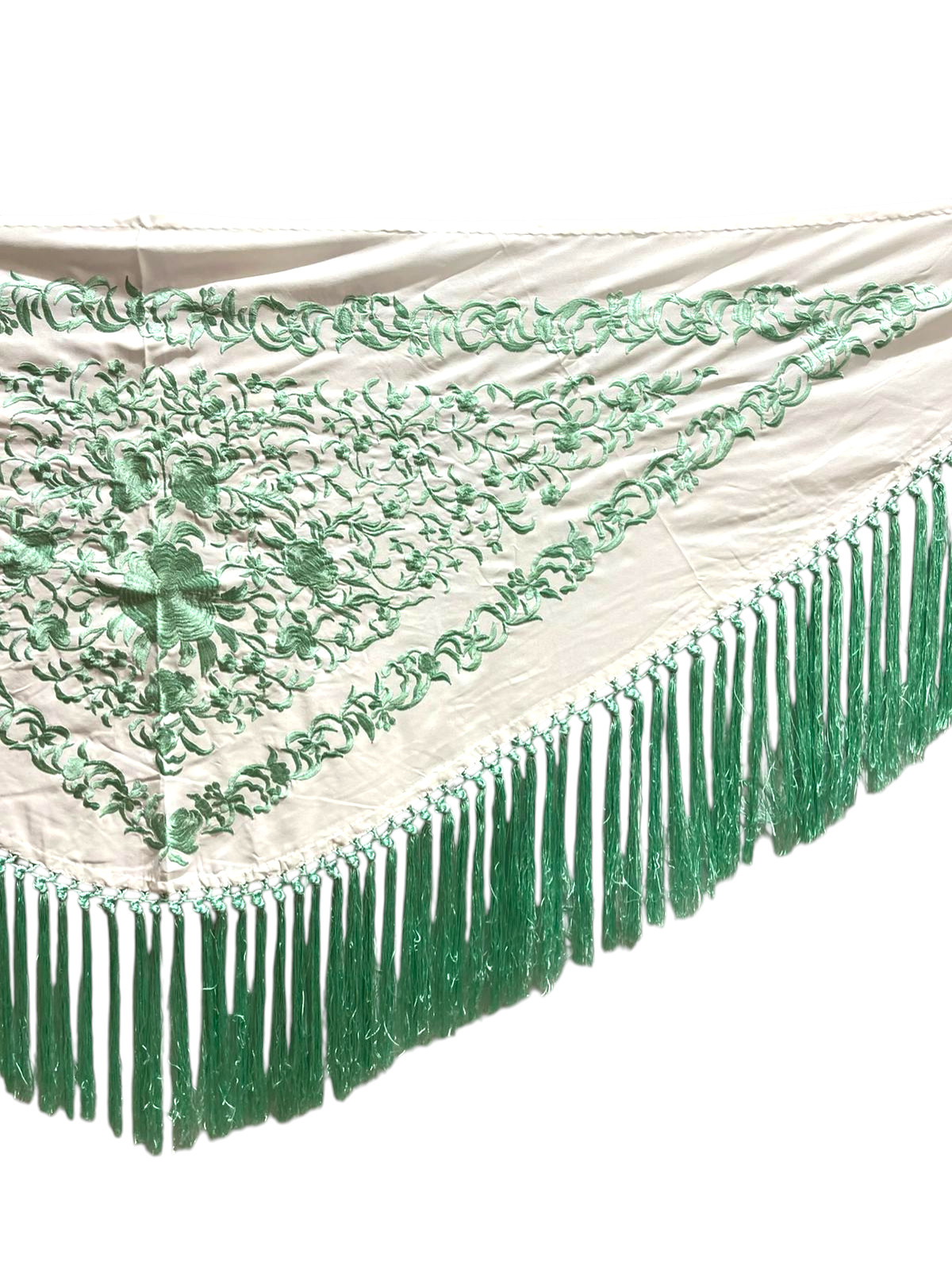 El flecado de seda, anudado a mano y en el mismo tono que el bordado, refuerza la armonía del diseño y aporta un acabado tradicional de gran calidad. Gracias a su fluidez y ligereza, este mantoncillo es ideal para realzar cada movimiento, tanto en baile como en feria o eventos.