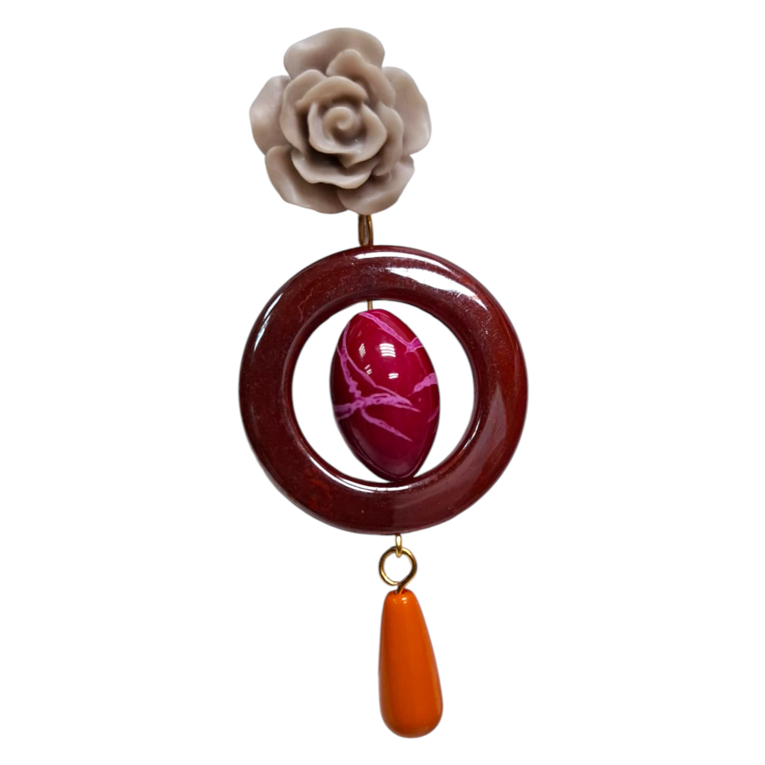 Pendientes de flamenca artesanales elaborados en Sevilla en resina de alta calidad, con diseño de aro central, pieza redonda y delicada lágrima decorativa que aporta movimiento y elegancia. El cierre con forma de rosa añade un acabado tradicional y muy femenino, ideal para completar cualquier traje de flamenca.