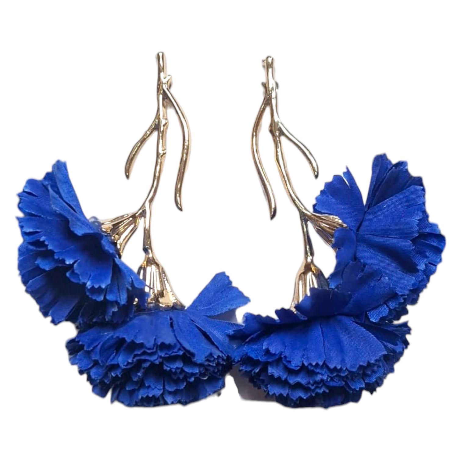 Pendientes de flamenca con 2 claveles pequeños azulón y rama dorada