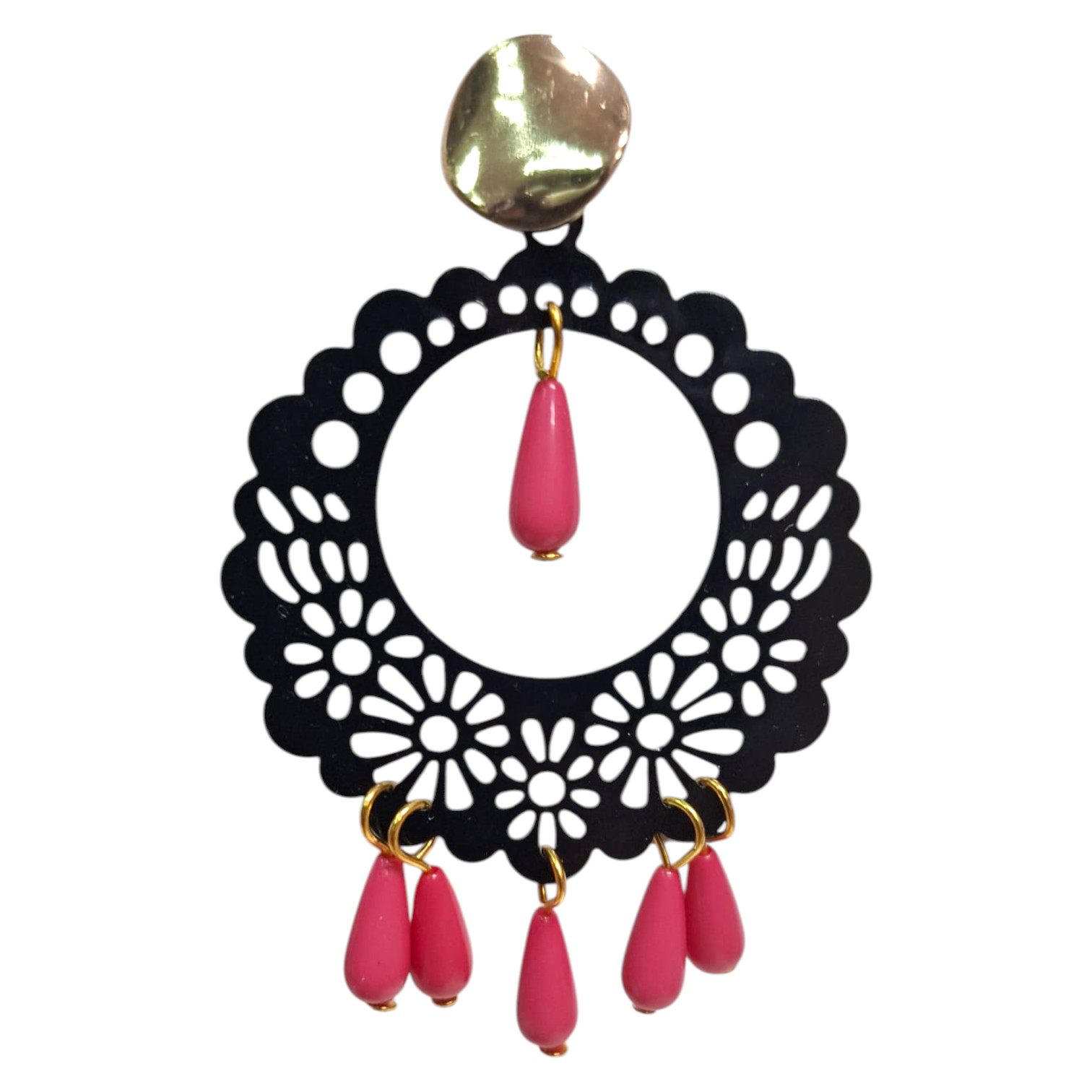 Pendientes flamencos con aro calado decorativo negro y lágrimas fucsias. Su diseño aporta dinamismo y un toque tradicional que encaja perfectamente con cualquier conjunto flamenco.