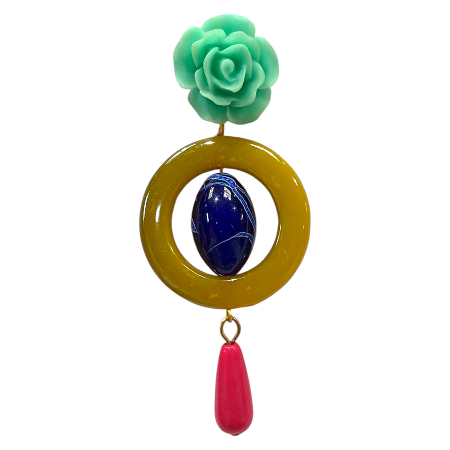 Pendientes flamencos hechos a mano en Sevilla, con diseño de aro central, detalle ovalado y lágrima decorativa. Su cierre en forma de rosa los convierte en un complemento ideal para feria, romería o baile flamenco.