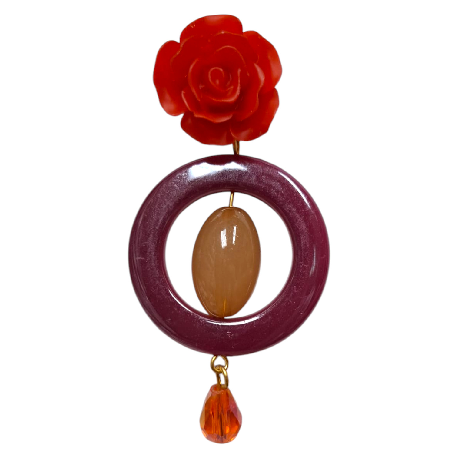 Pendientes de flamenca en resina creados de forma artesanal, con un diseño exclusivo que incluye aro, pieza ovalada y lágrima pequeña, además de clip en forma de rosa. Ideales para complementar cualquier traje de flamenca o look de baile. Fabricados en Sevilla (España), garantizan estilo y tradición.