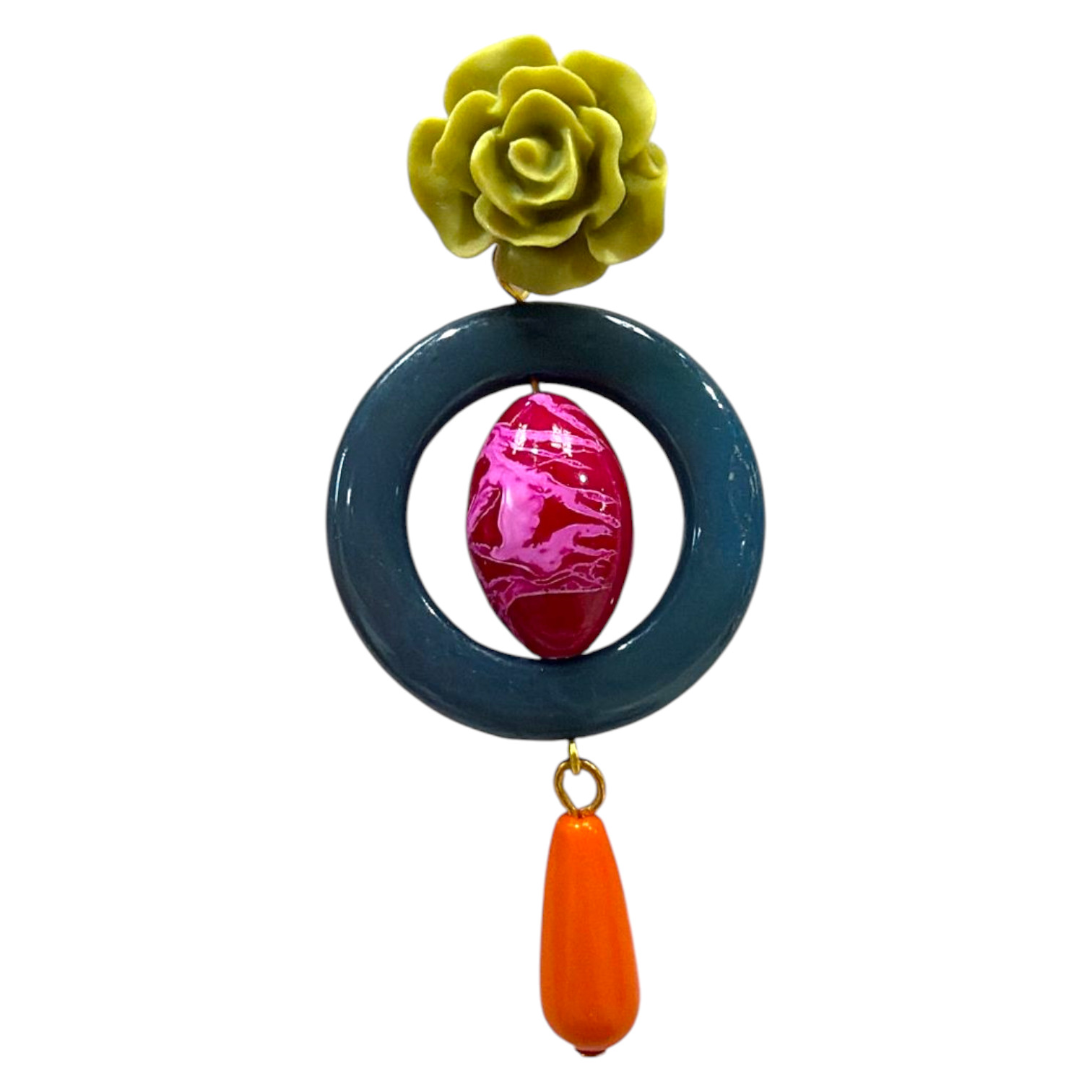 Pendientes de flamenca hechos a mano en Sevilla, elaborados en resina con aro central, detalle redondo y pequeña lágrima decorativa. Incorporan un cierre con forma de rosa que aporta un toque tradicional. Ideales para feria, romería o eventos flamencos.