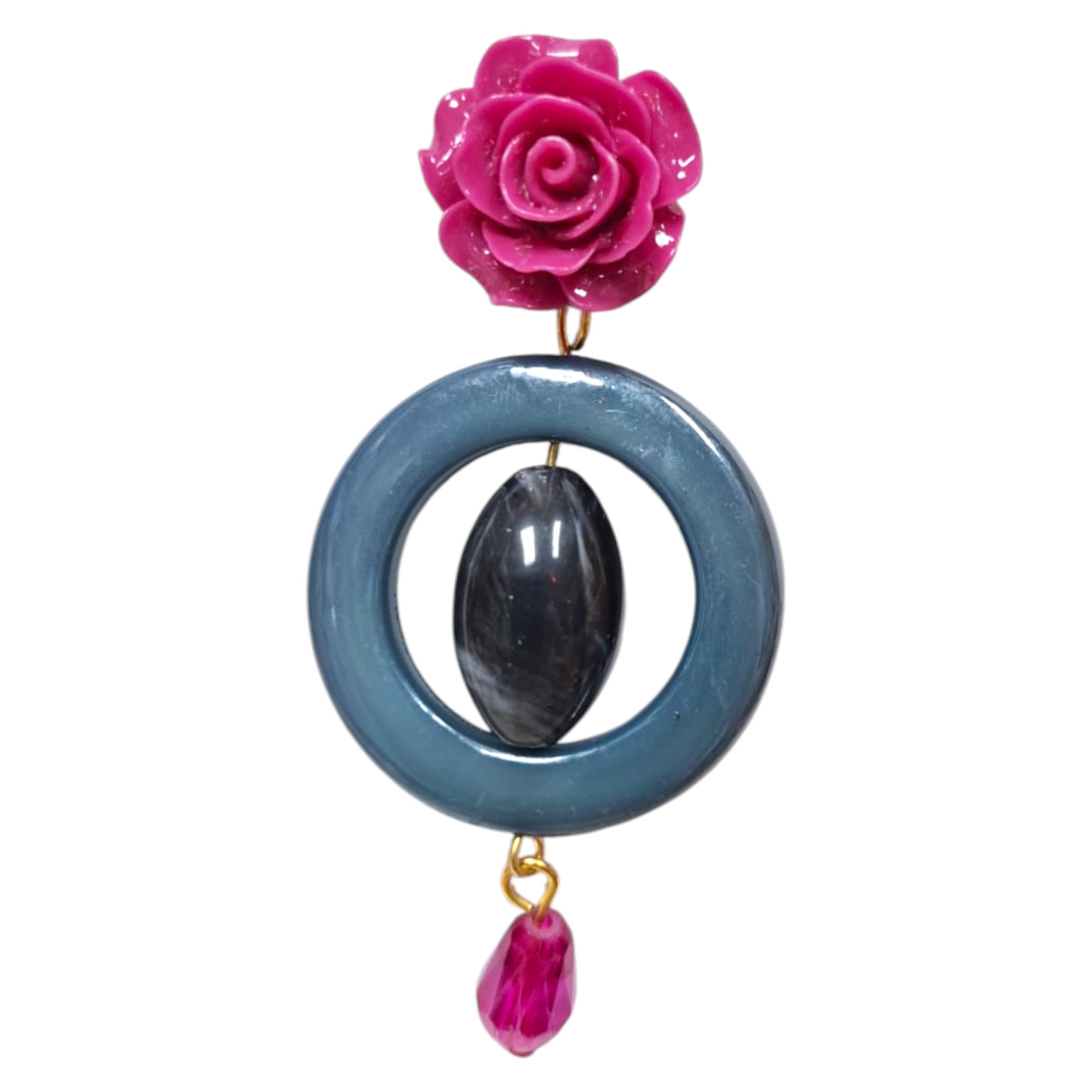 Pendientes de flamenca elaborados artesanalmente en resina, con aro central, detalle ovalado y pequeña lágrima decorativa, acompañados de un clip con forma de rosa. Estos pendientes son ideales para ferias, romerías o espectáculos de baile flamenco. Hechos a mano en Sevilla (España), aportan un toque elegante y auténtico a cualquier look flamenco.