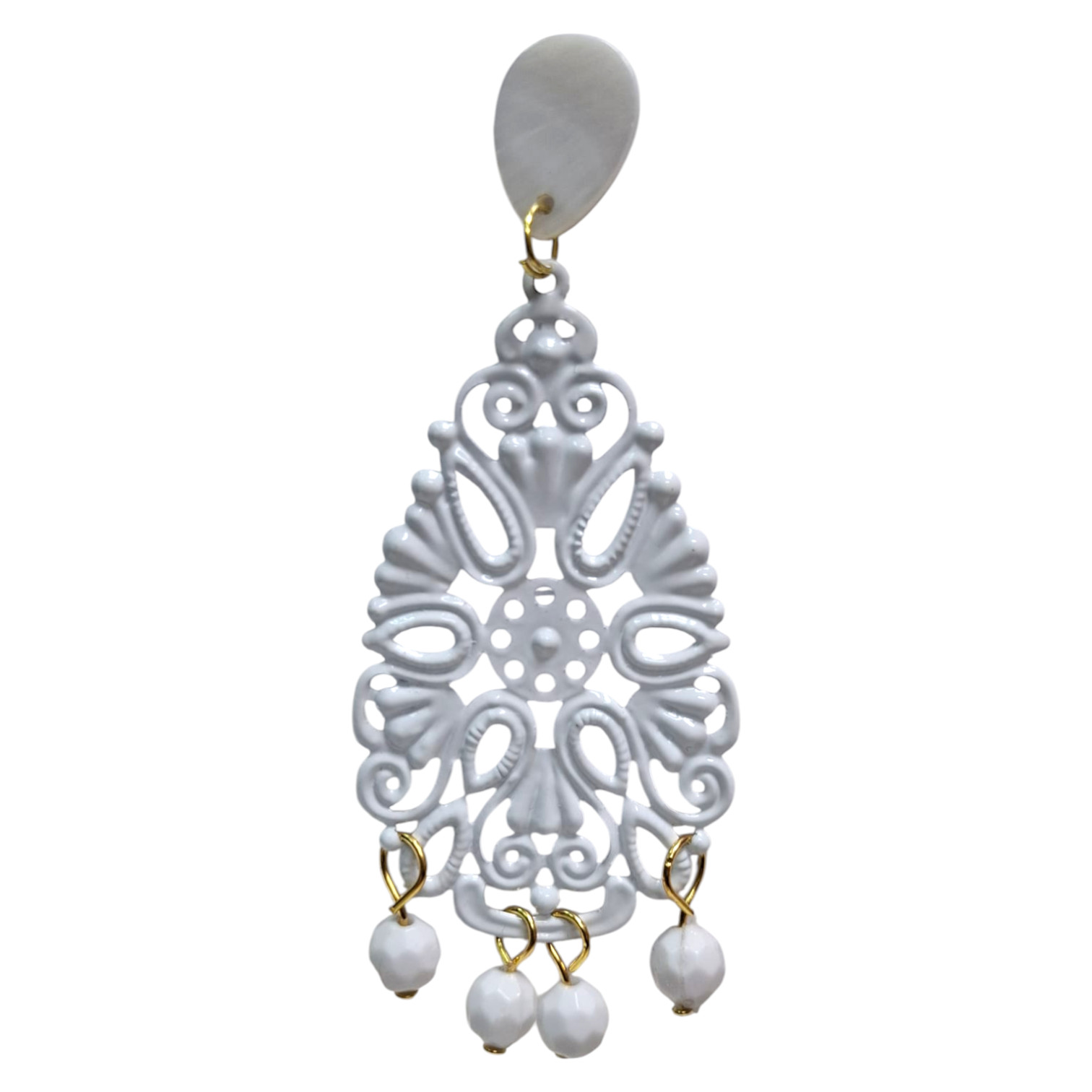Pendientes de flamenca hechos a mano con una elegante pieza central ovalada de filigrana metálica, decorados con bolitas colgantes que aportan movimiento y sofisticación. Estos pendientes tan flamencos son perfectos para combinar con trajes de flamenca, vestidos de baile o lucirlos en cualquier evento especial. Hechos en Sevilla (España), destacan por su ligereza y estilo tradicional.
