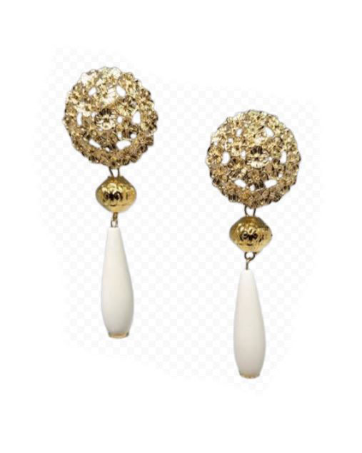 Tienen un largo aproximado de 8 cm, lo que los convierte en un complemento llamativo sin resultar pesados. Están fabricados con piezas de cobre bañadas en oro hipoalergénico, bolas doradas y elementos naturales cuidadosamente seleccionados. Son extremadamente ligeros, por lo que resultan muy cómodos incluso durante largas jornadas.